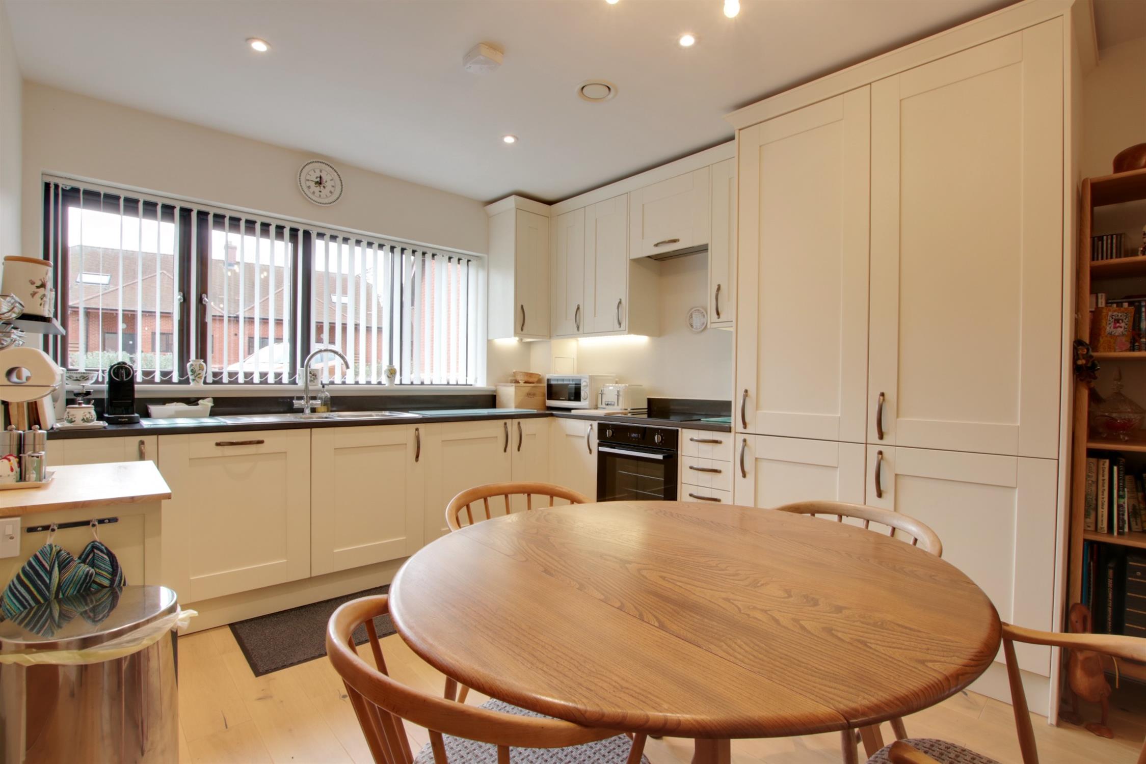 With double glazed window to front elevation. One and a half bowl stainless steel single drainer sink unit with cupboard under. Further range of wall and base level units with quartz work surface over. Built-in four ring induction hob with cooker hood over and electric oven under. Built-in and concealed dishwasher, washing machine and fridge/freezer. Larder cupboard where 'Worcester' gas boiler can be found. Inset ceiling spotlights. Engineered wooden flooring which continues through to: