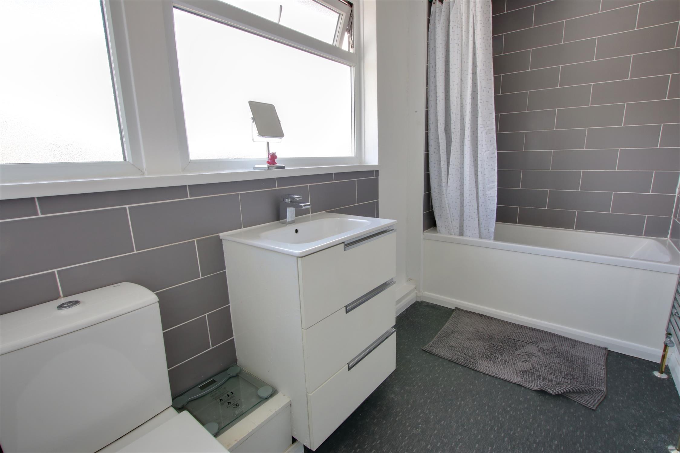 Two double glazed windows to rear elevation. Panel enclosed bath with shower unit over with monsoon shower head. Vanity unit with wash hand basin and storage beneath. Low level close coupled WC. Heated chrome towel rail. Part tiled walls. Inset ceiling spotlights.