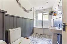 Double glazed window to the rear aspect. Smooth ceiling with inset spotlighting. Extractor fan. Modern suite comprising 'P' shaped bath with shower over and screen. Low level WC. Wash hand basin. Part panelled walls. Tile effect flooring.