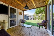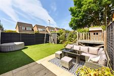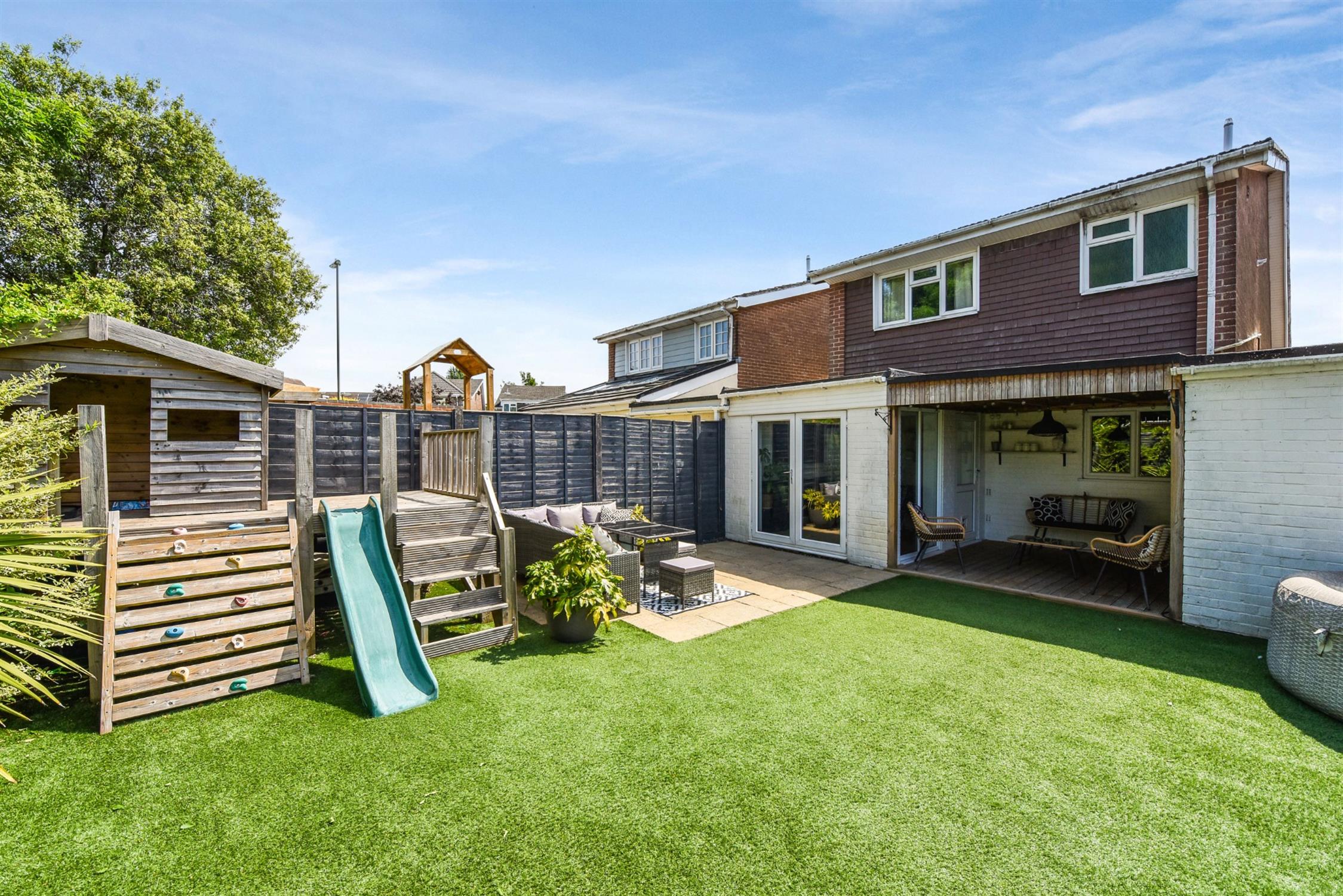 The rear garden has an initial covered seating area with the remainder of the garden artificial turf with raised borders, timber garden shed, patio area and children's playhouse (which can remain or be removed).