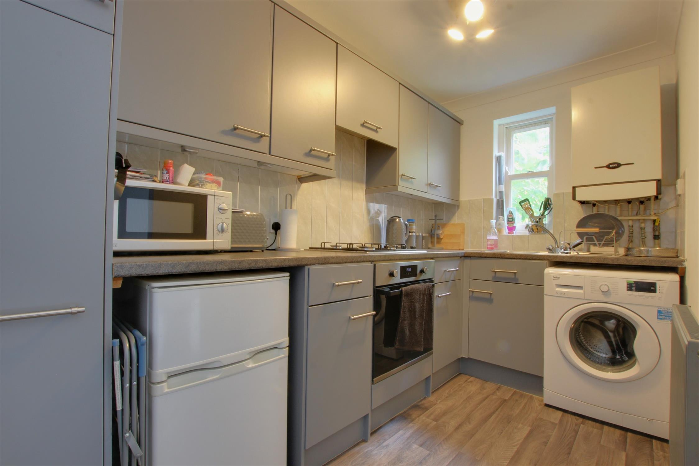 Work surfaces having cupboards and drawers beneath, wall mounted matching units, tiled splash backs, inset stainless steel sink and drainer with mixer tap, fitted oven with hob and canopy over, space and plumbing for washing machine, space for low level fridge / freezer, radiator, wall mounted boiler, double glazed window to rear aspect, smooth and coved ceiling, vinyl floor.