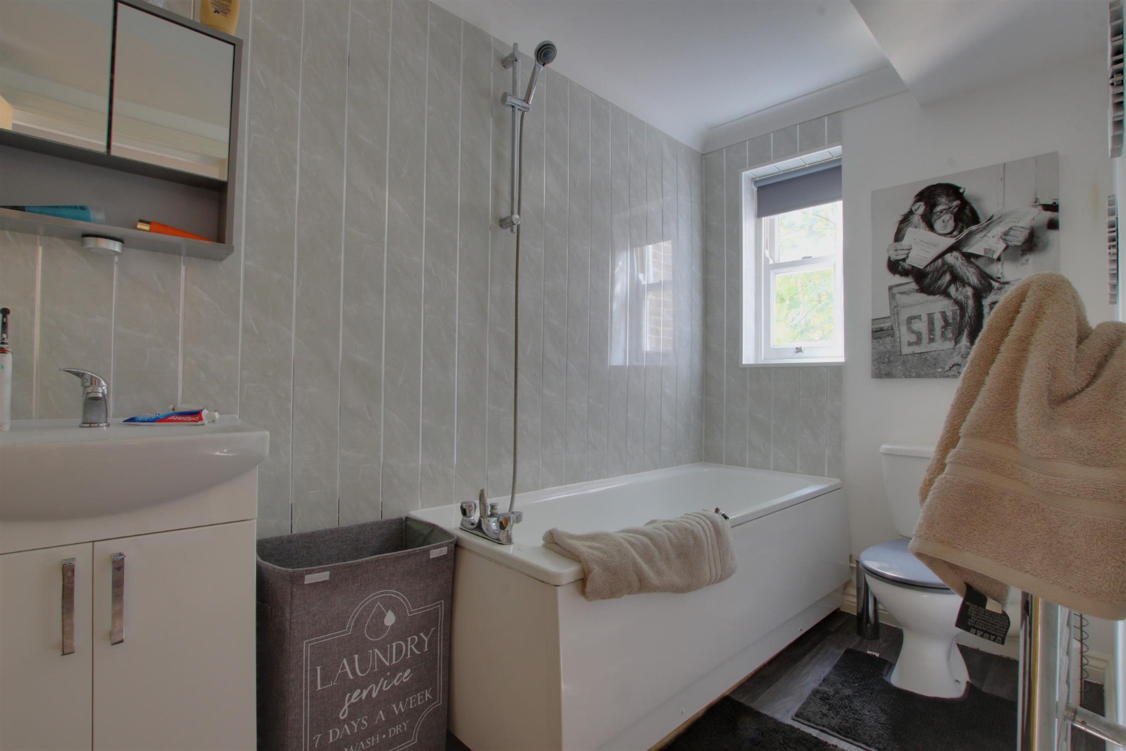 Panel enclosed bath with mixer tap and shower attachment with rail over, close coupled w.c., pedestal hand wash basin, heated towel rail / radiator, vinyl floor, extractor fan, smooth and coved ceiling, double glazed window to the rear aspect.