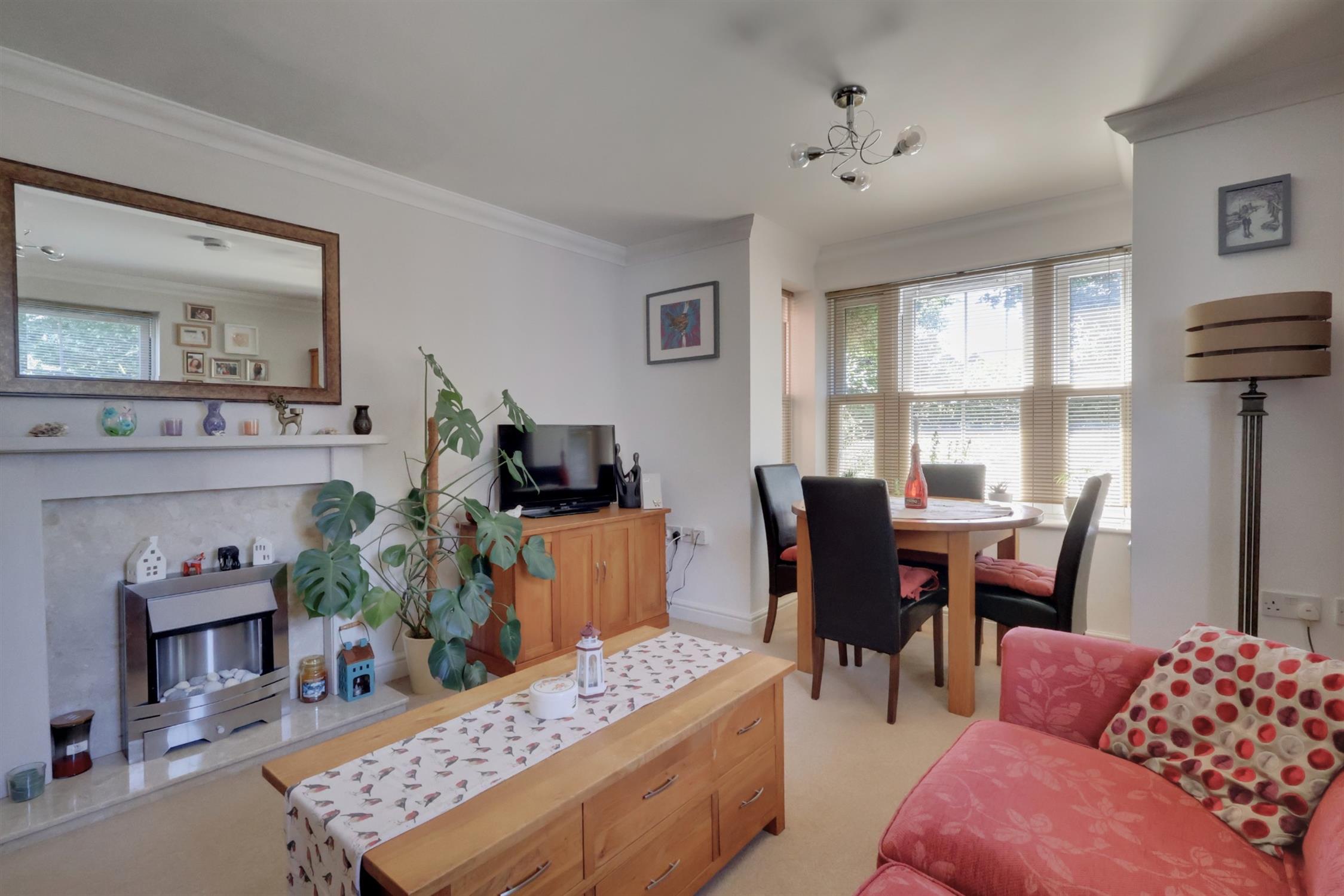 Double glazed twin aspect room with square bay to front elevation set around feature fireplace with 'living flame' effect electric fire. TV point. Dimplex storage heater.