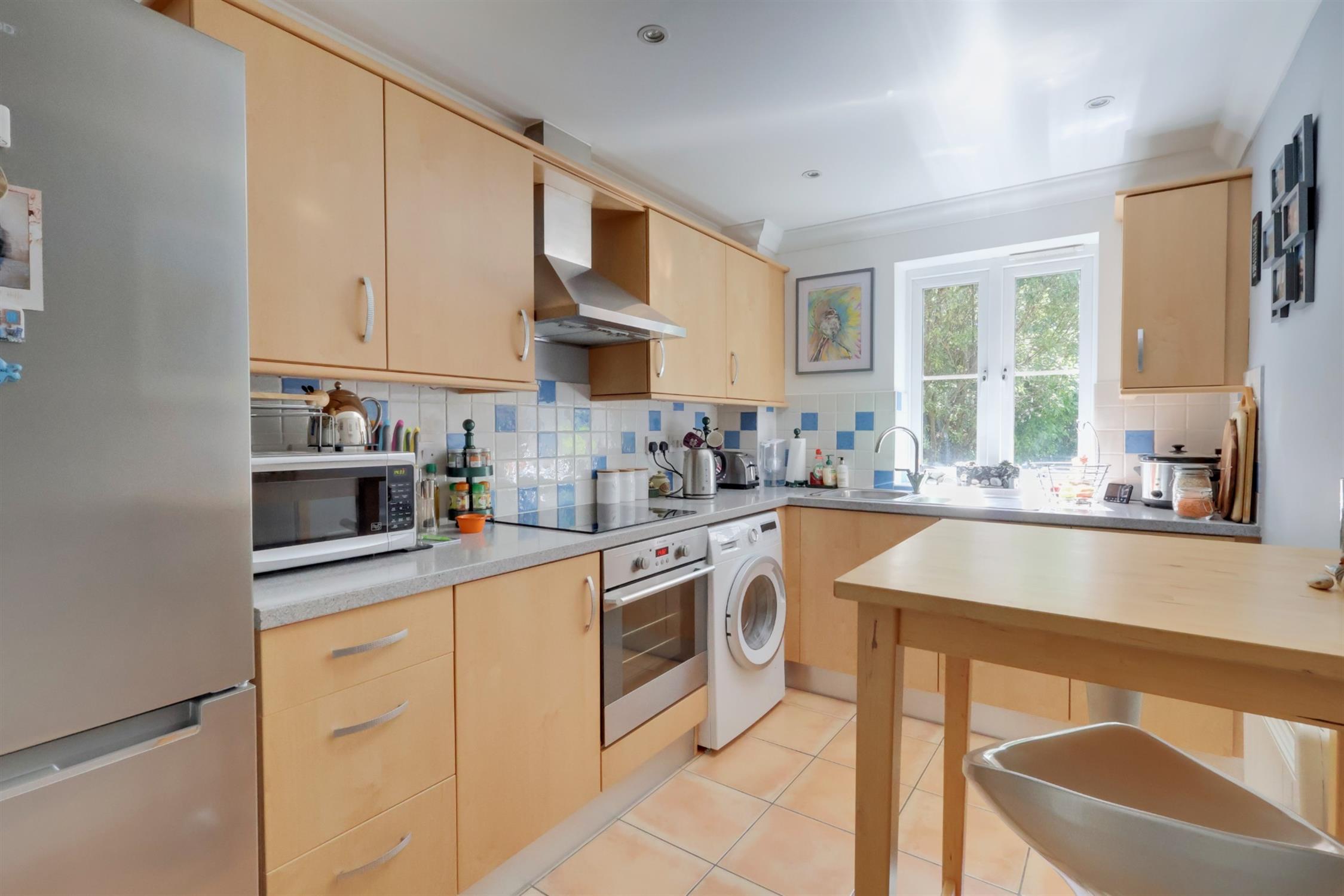 Double glazed window to front aspect. Range of fitted wall and floor units with contrasting work surfaces and complementary tiling. Inset one and half bowl sink unit with mixer tap. Four ring hob with built-in oven below and extractor hood over. Plumbing for automatic washing machine. Space for upright fridge / freezer. Dimplex storage heater. Tiled flooring.