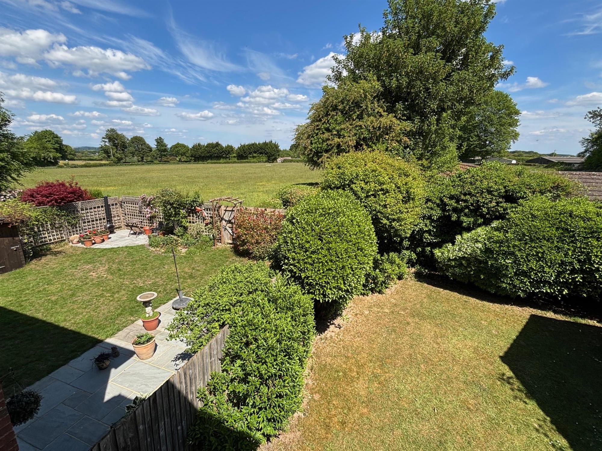 A very private space with a range of mature planting and hedges, with patio, lawn and access to the garage.