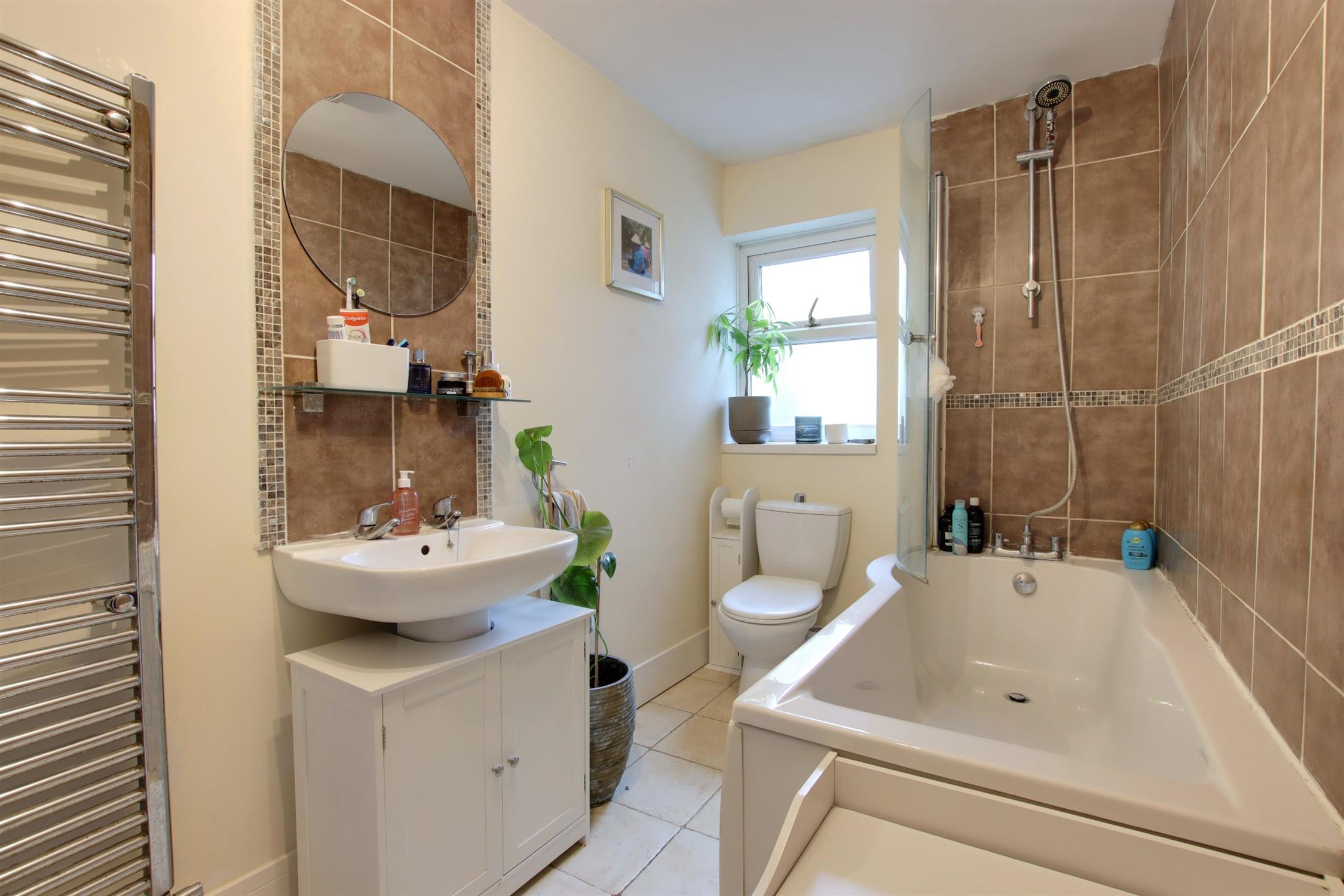 Double glazed obscure window to rear. Smooth ceiling with extractor fan. Suite comprising: 'P' shaped bath with hand shower and screen. Low level WC. Wash hand basin. Part tiled walls. Heated towel rail. Tiled flooring.