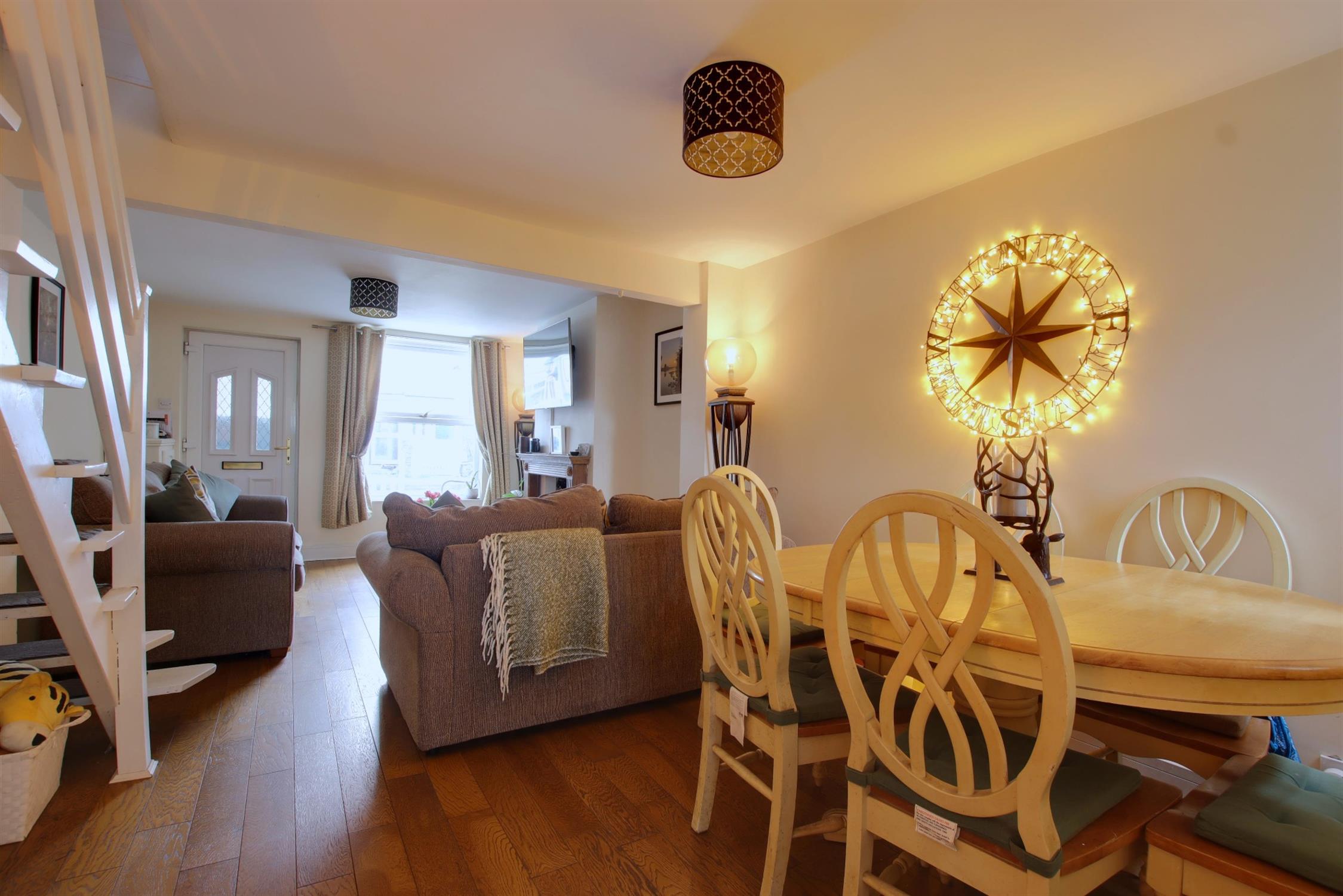 Dual aspect room with double glazed windows to front and rear. Smooth ceiling. Stairs to the first floor. Two radiators. Engineered wooden flooring.