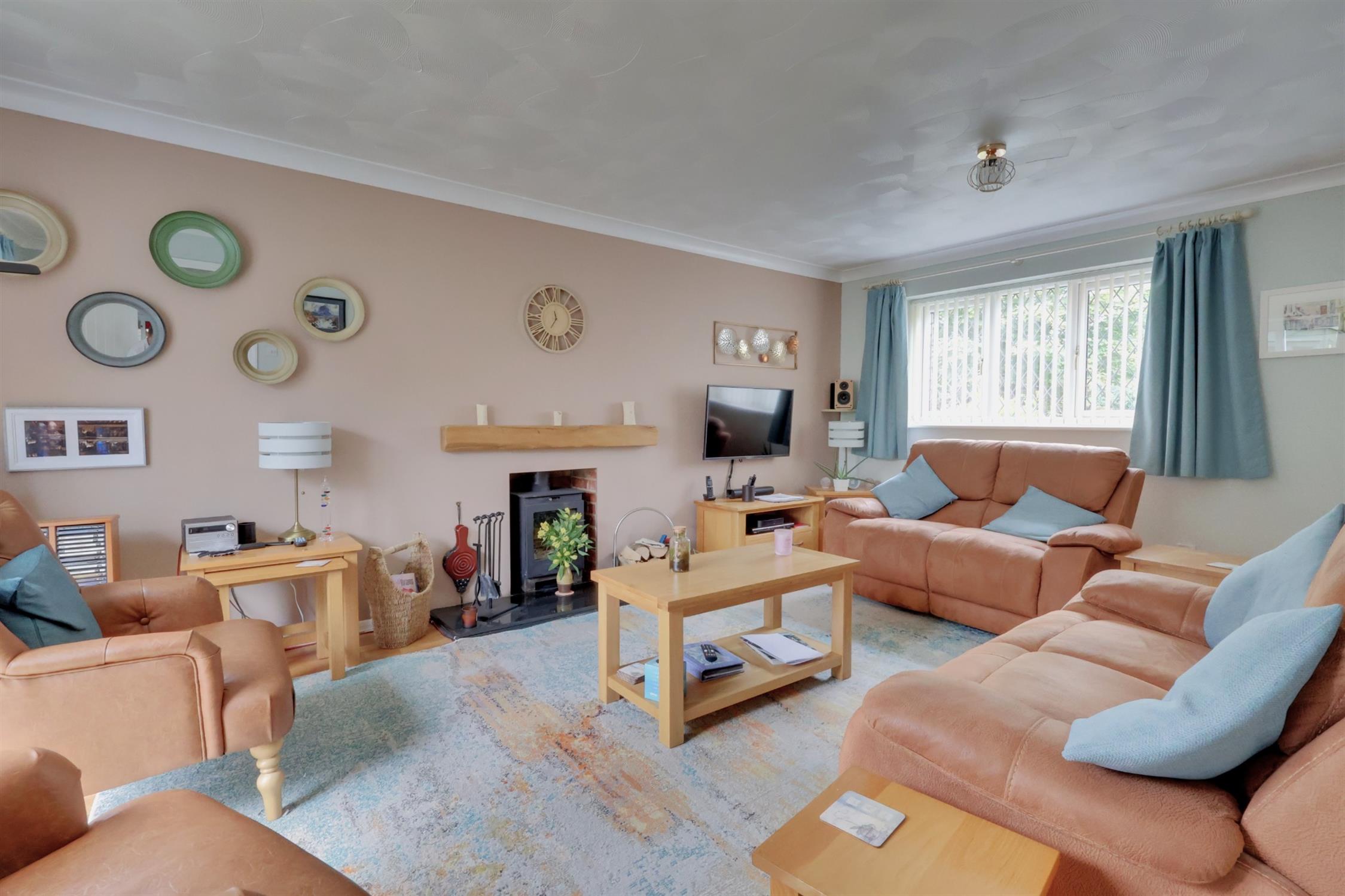 Coved ceiling. Upvc window to front aspect and Upvc patio doors to rear. Feature log burner with granite hearth and wooden mantel above. Oak style laminate flooring. Radiator. Access to dining room.
