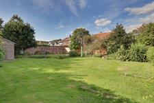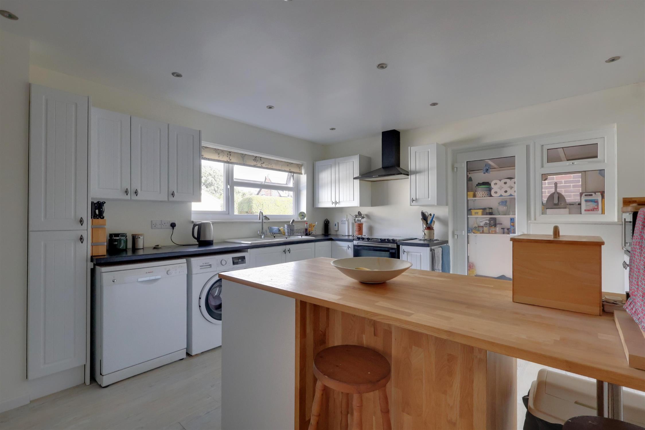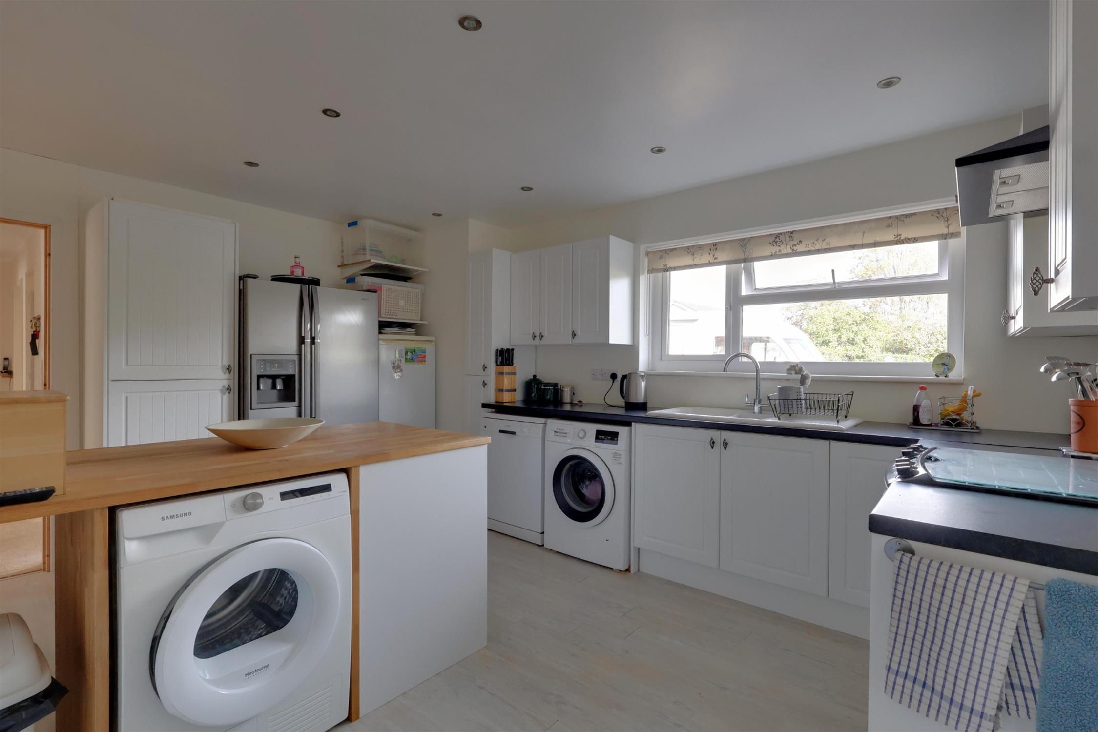 A range of wall and base cupboards with work surface over. Inset one and a half ceramic sink with drainer. Space for gas hob and oven with extractor fan over. Radiator. Door to side access. Two double glazed windows.