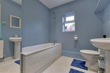 Panelled bath with shower attachment. WC. Ceramic sink. Radiator. Frosted double glazed window.