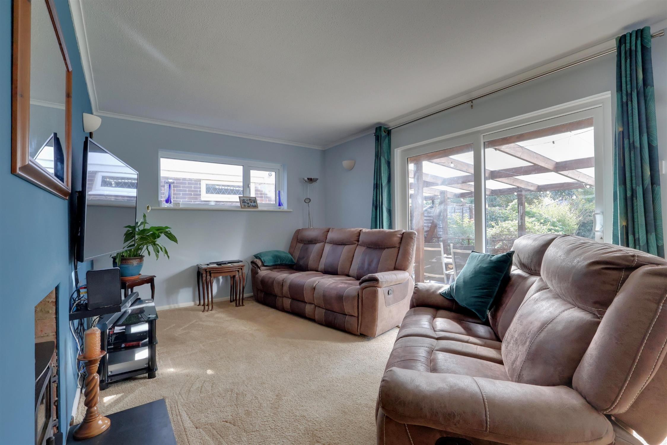 Multi-fuel burning stove. Sliding doors to the rear garden. Two radiators. Two double glazed windows.