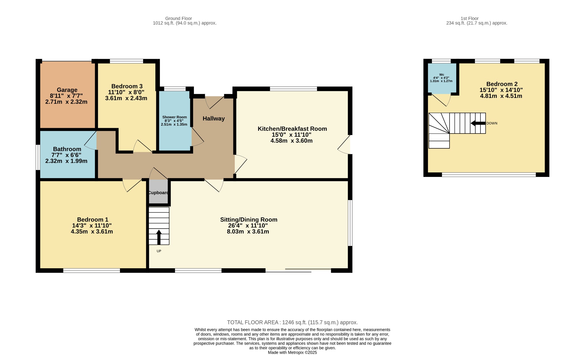 Shower cubicle. WC. Ceramic sink. Heated towel rail. Frosted double glazed window.