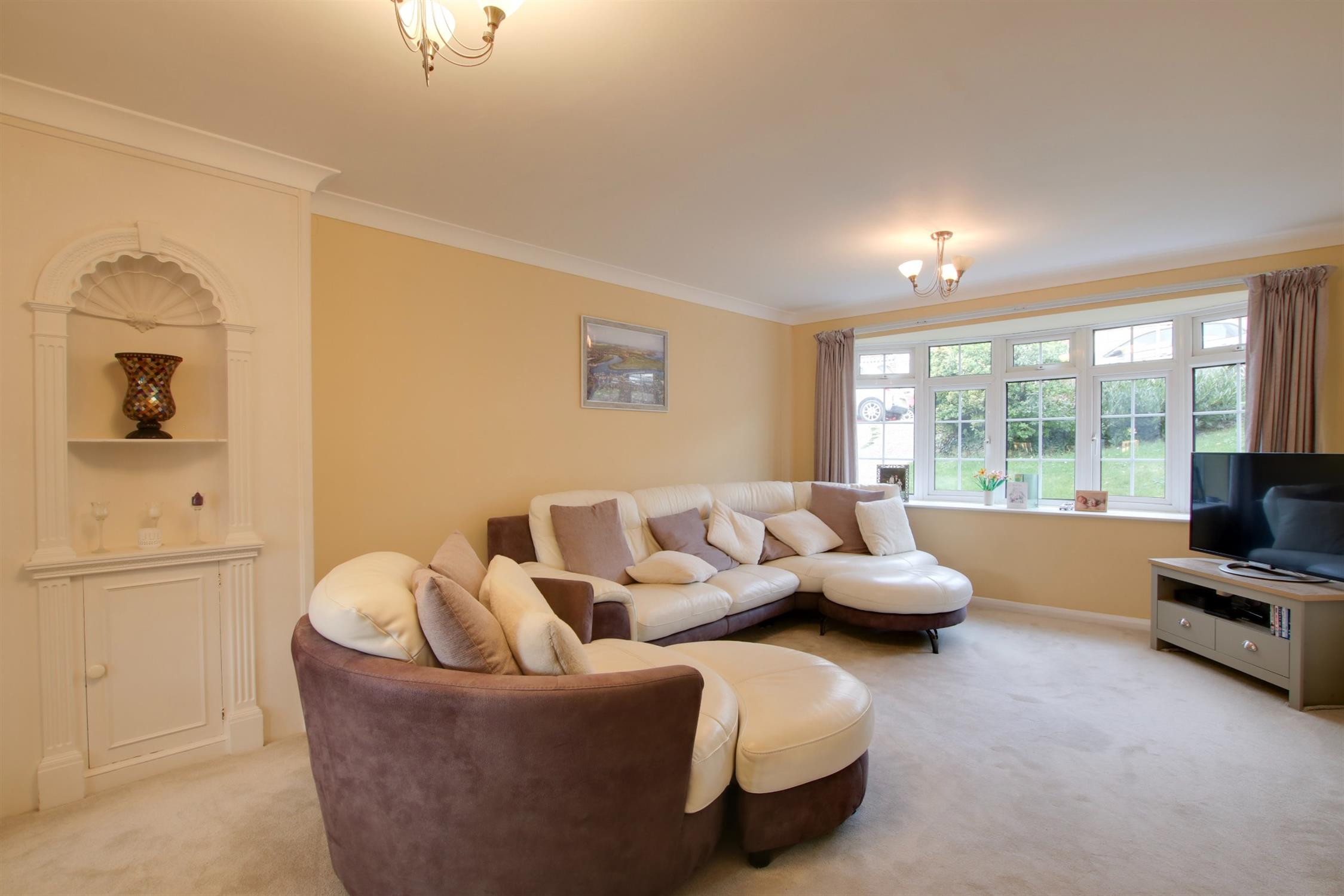 Double glazed bow window to front elevation. Coved and skimmed ceiling. Attractive shelving with storage cupboard beneath. Glazed doors to: