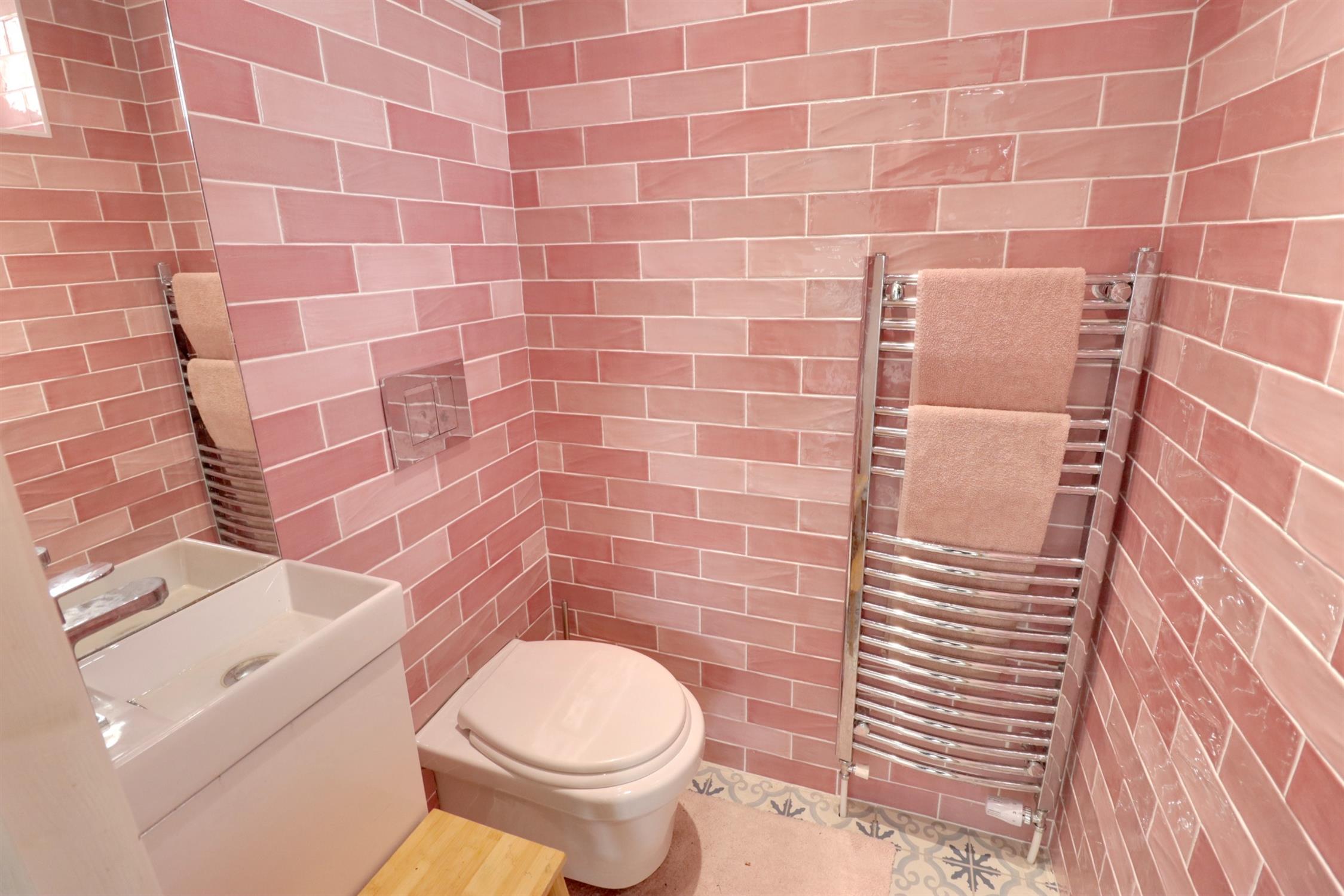 Opaque double glazed window to side, dual flush WC, hand basin with mixer tap, ladder-style towel radiator, wall-mounted extractor fan, ceiling extractor, tiled walls, smooth skimmed ceiling.