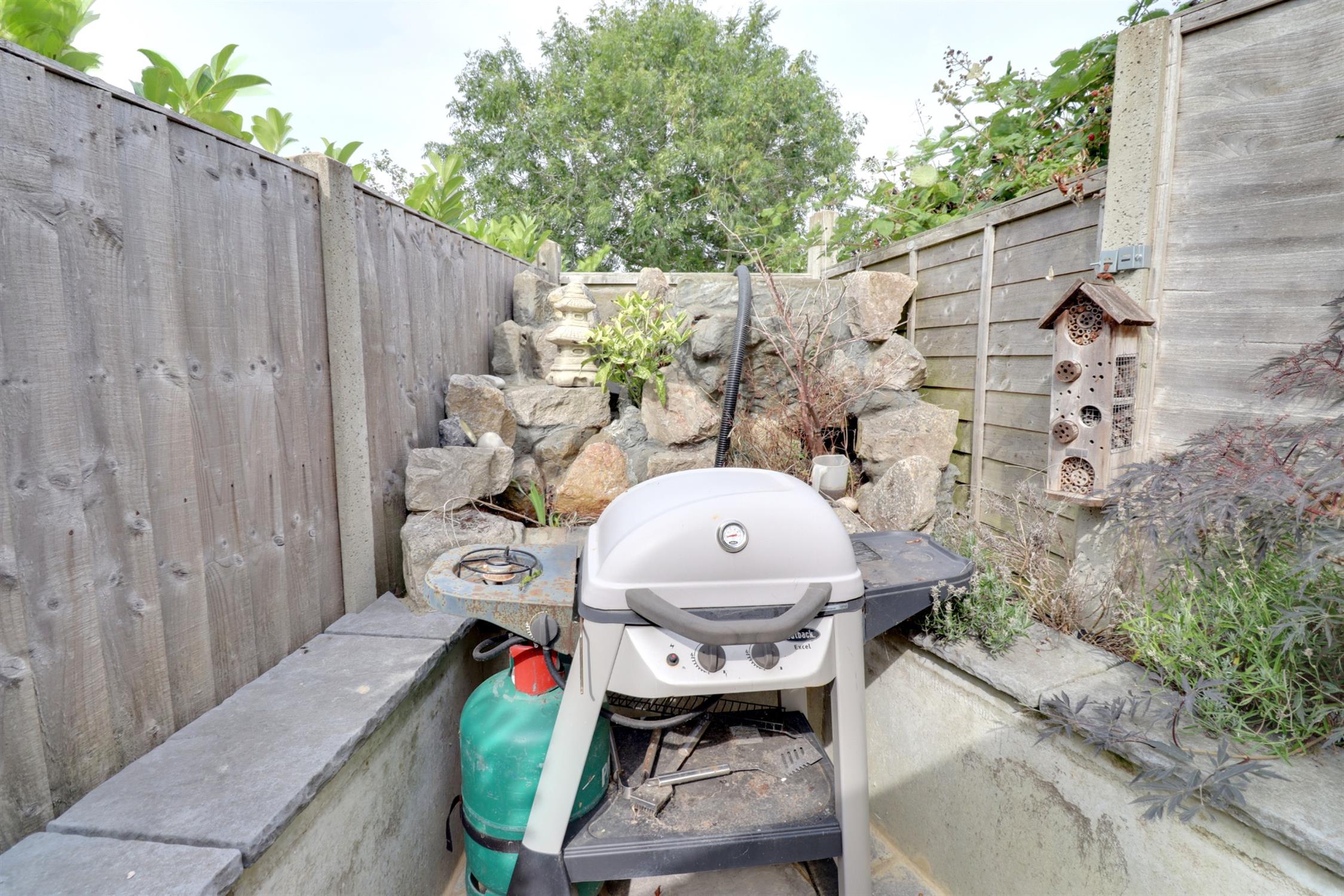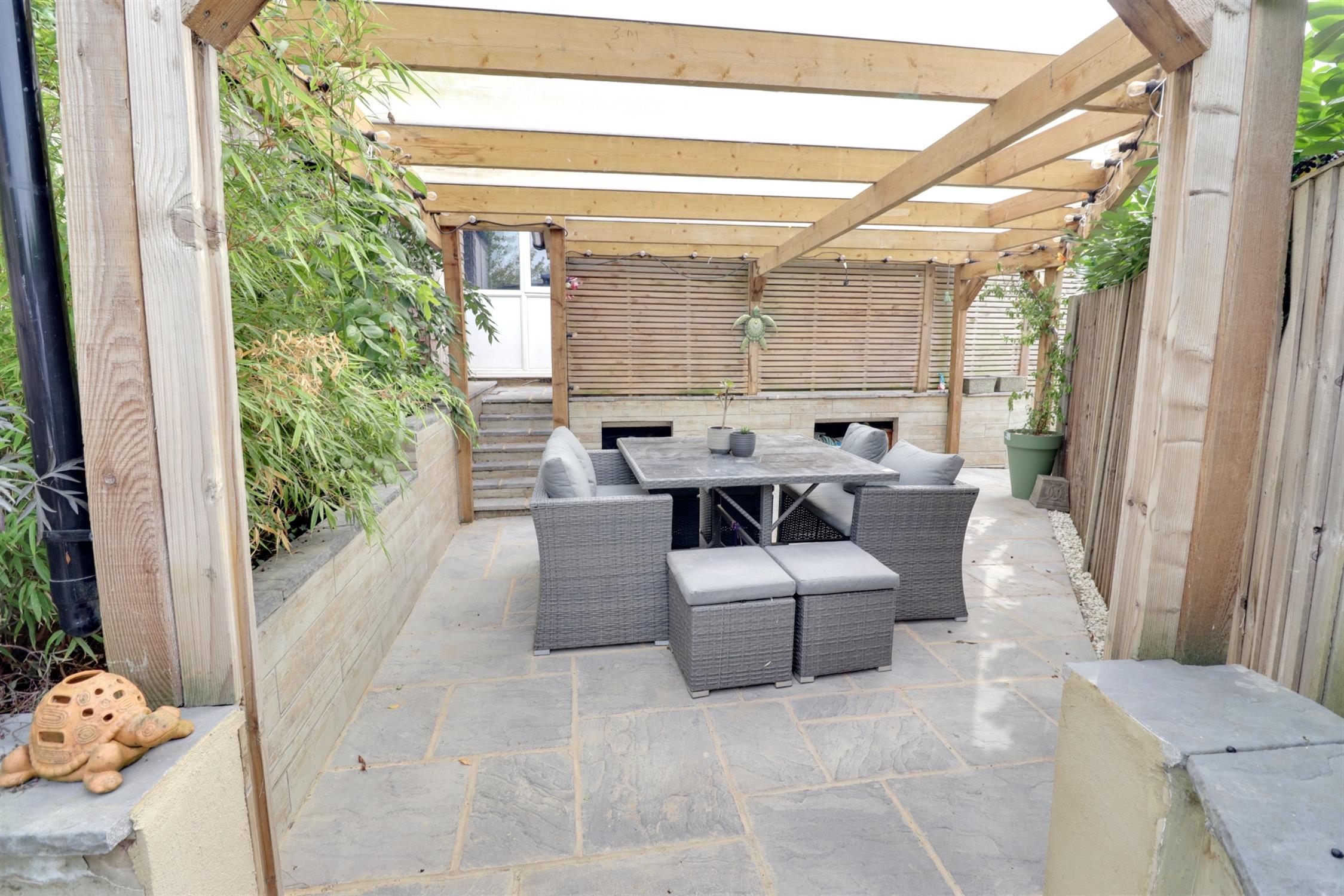 Closeboard fence enclosed, private and westerly aspect, paved path, patio and steps leading down to lawned area, timber shed, laurel hedge, gated access to ‘secret garden’ with Thermalite storage shed (12ft6 x 8ft 10) with power and light. Pergola covered patio and entertaining area with raised planters with mature shrubs, timber screening, feature rockery with water feature.