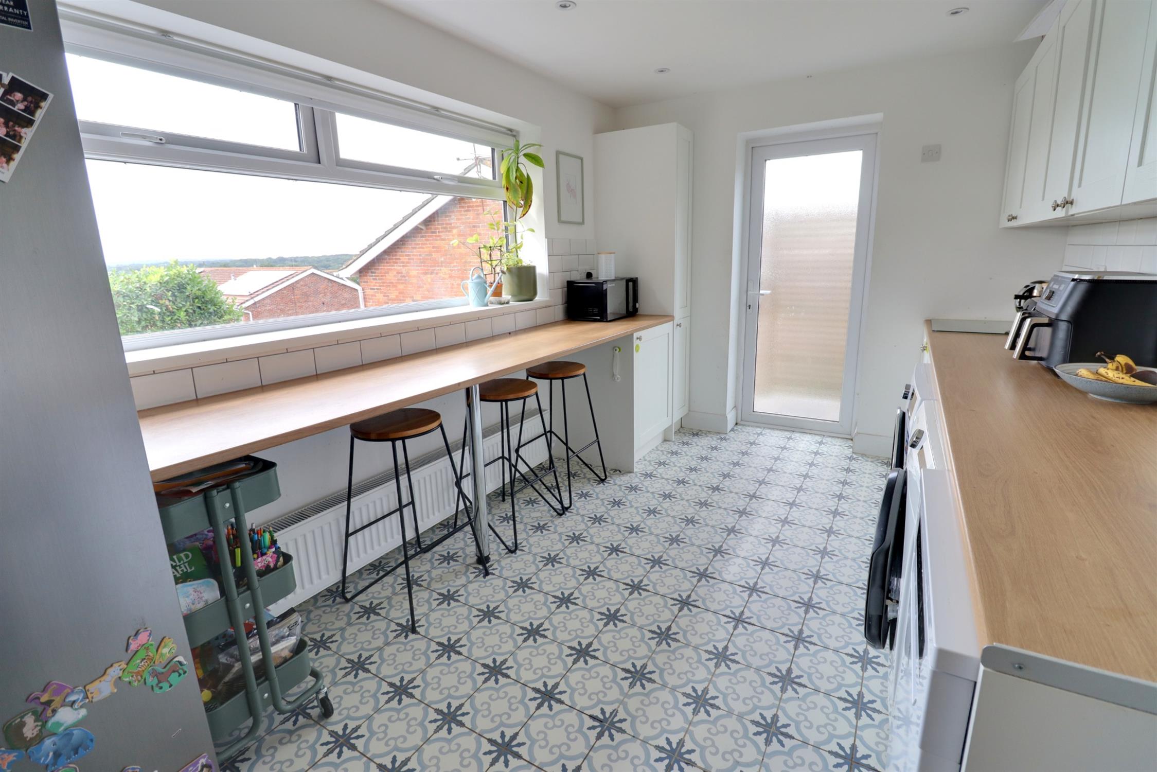 Double glazed window to side with panoramic views over surrounding countryside, double glazed door to rear, wall and base units with roll top work surfaces, breakfast bar, plumbing and space for dishwasher, washing machine and tumble dryer, radiator, door to: