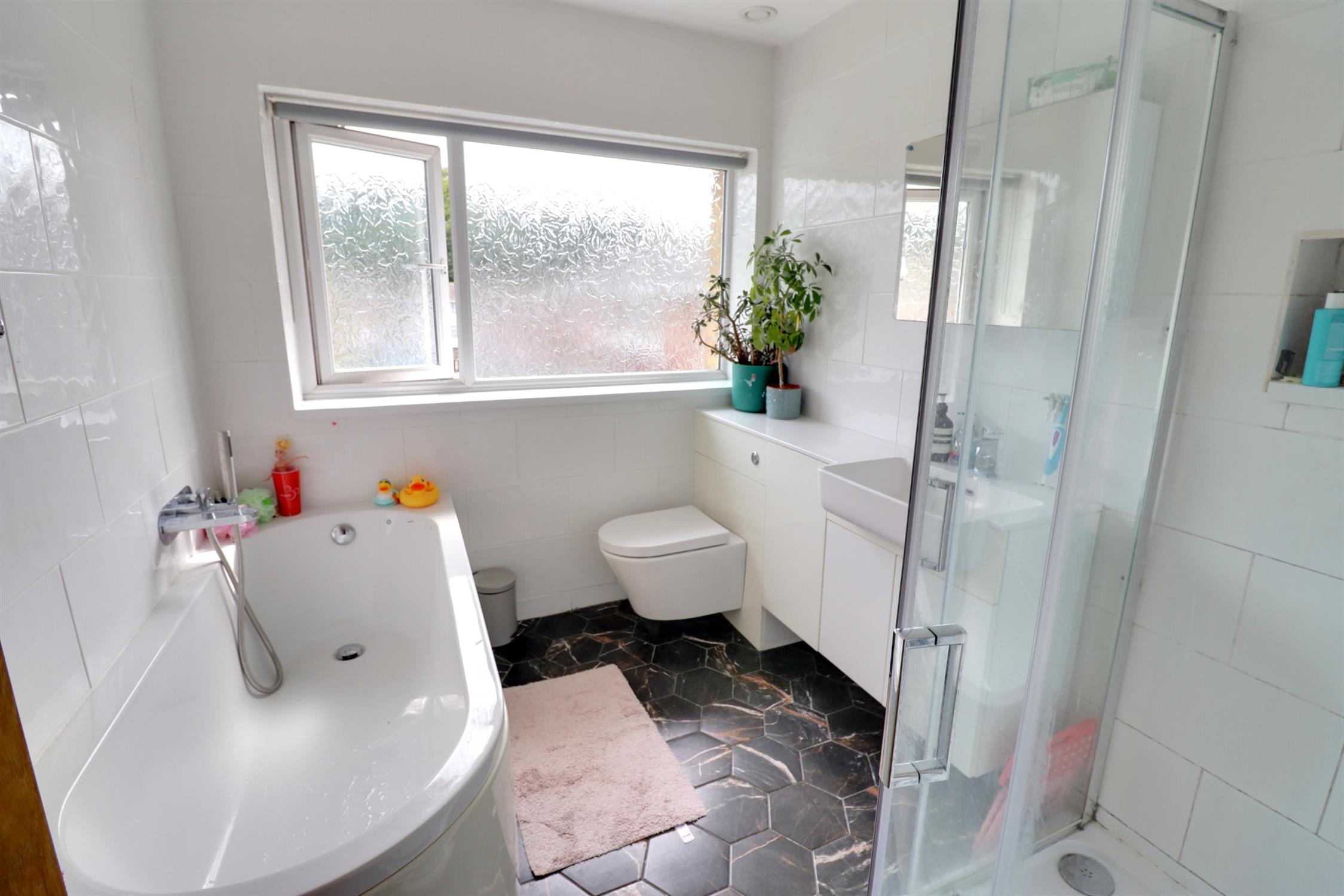 Opaque double glazed window to front, panel enclosed bath with mixer tap shower attachment, dual flush WC, hand basin with mixer tap and vanity storage cupboard, tiled corner shower cubicle, ceiling extractor, smooth skimmed ceiling.