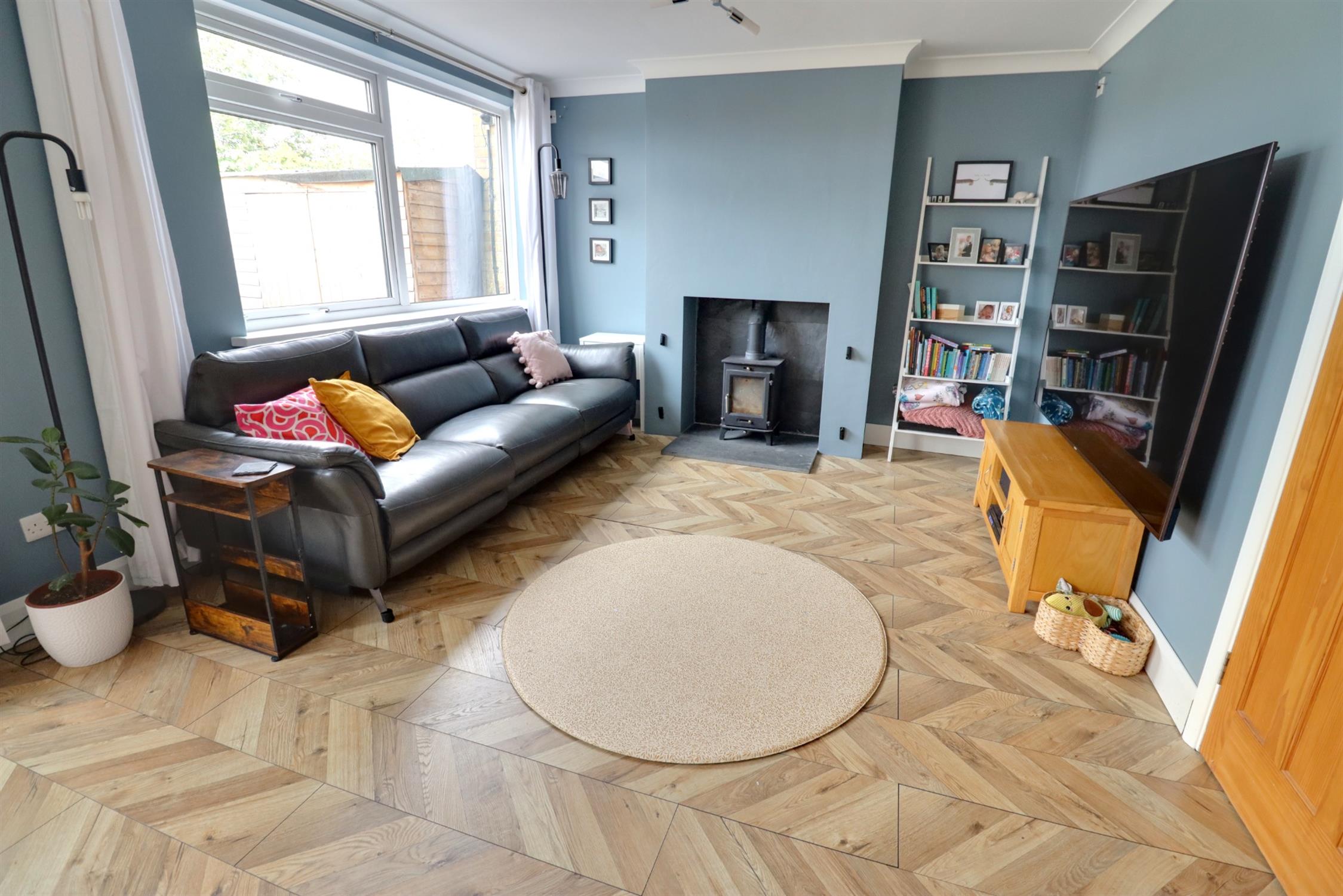 Two double glazed windows to rear, double glazed door to rear garden, chimney breast with wood burner and stone hearth, TV point, smooth skimmed and coved ceiling.