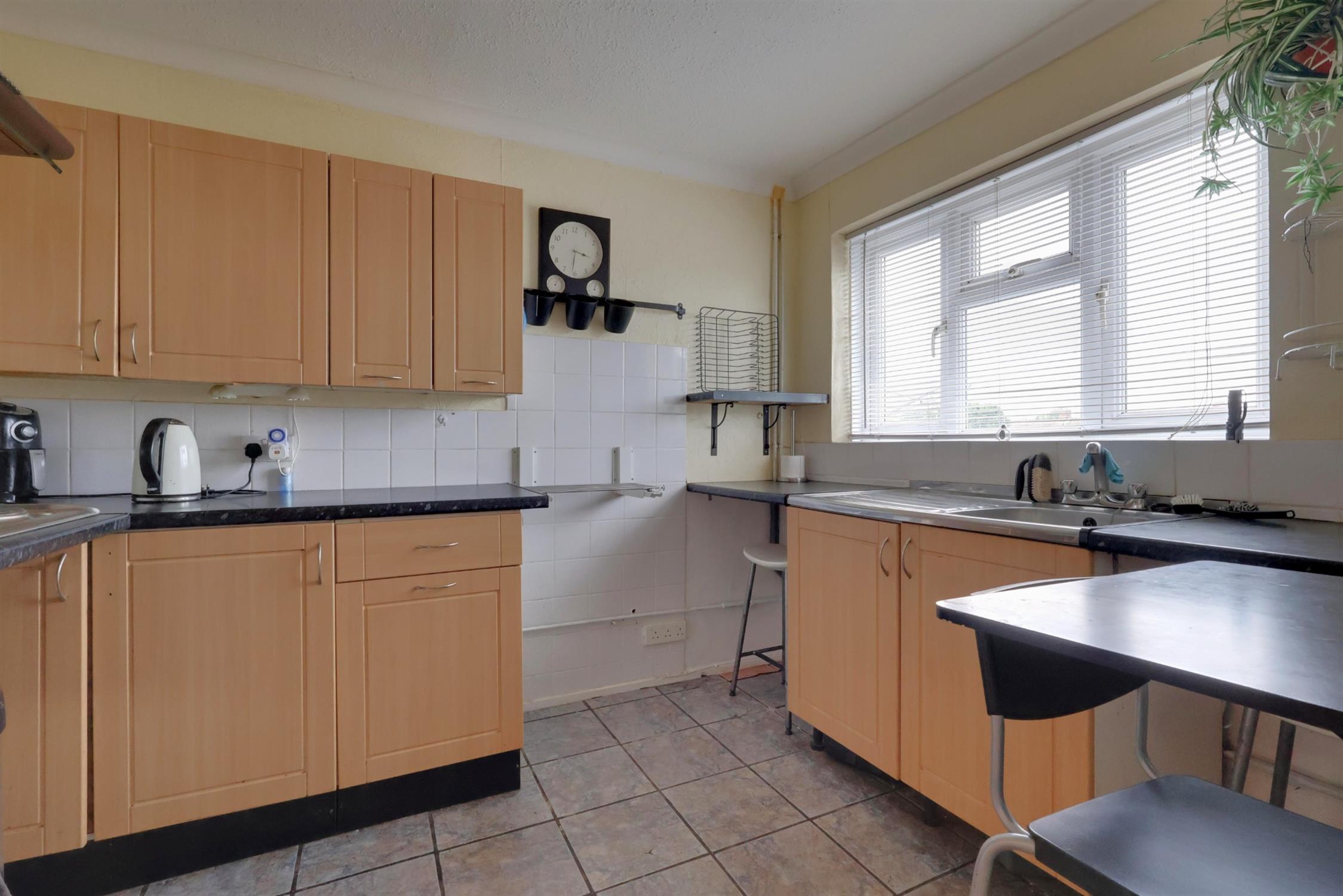 Double-glazed window to the front elevation and is fitted with a range of wall and base units with rolled-top work surfaces. It includes an integrated electric hob with extractor over, a stainless steel sink with mixer tap, space for a fridge and washing machine, and part-tiled walls.