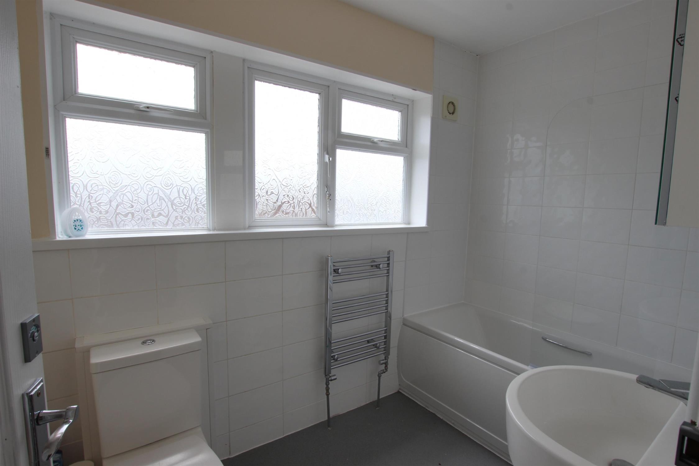 BATHROOM; White suite comprising bath, with wall mounted shower over, W.C. pedestal wash hand basin, chrome heated towel rail, double glazed window.