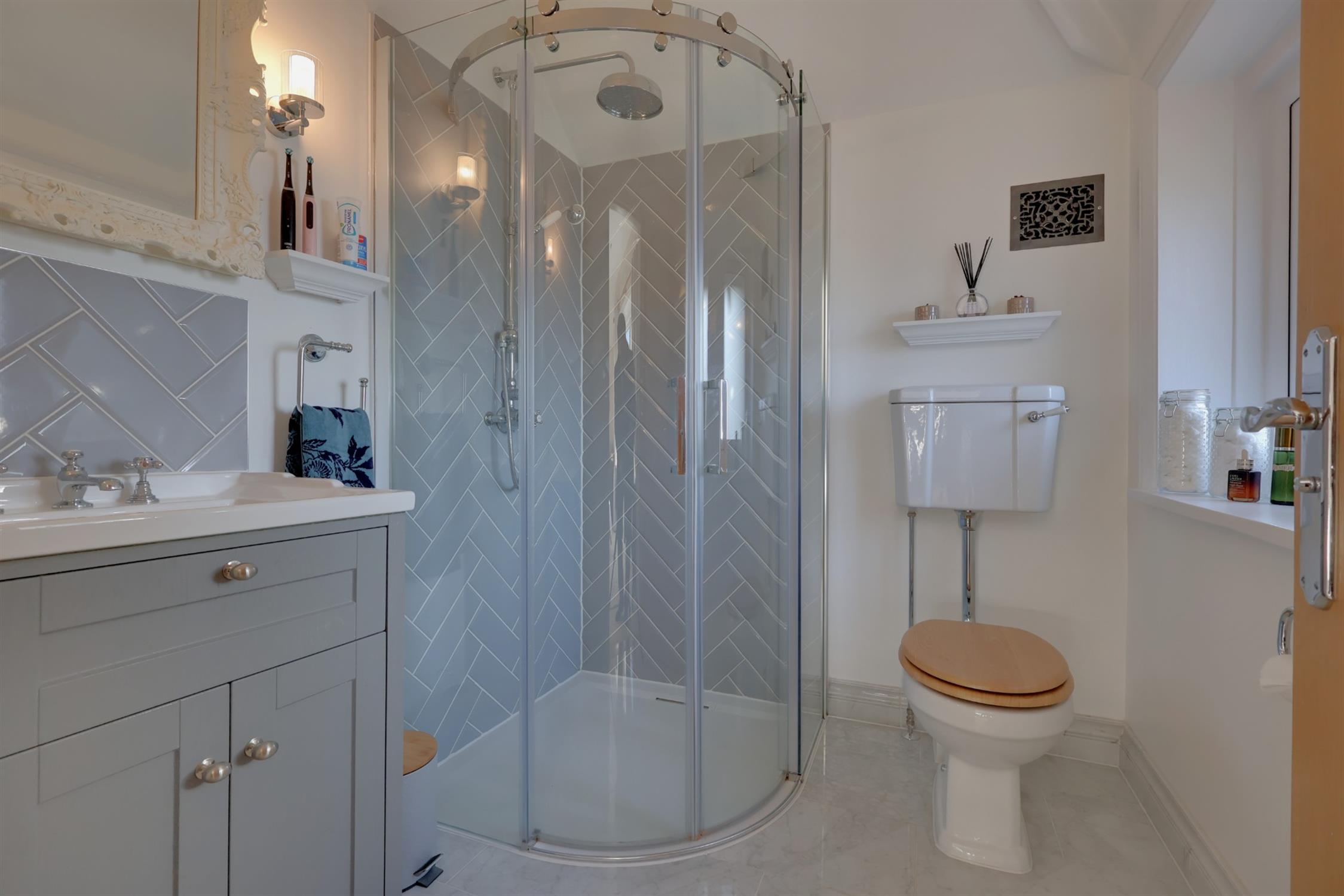 Walk-in shower cubicle with Rainfall shower attachment. Ceramic sink with cupboard under. WC. Heated towel rail. Carrara marble flooring. Frosted double glazed window.