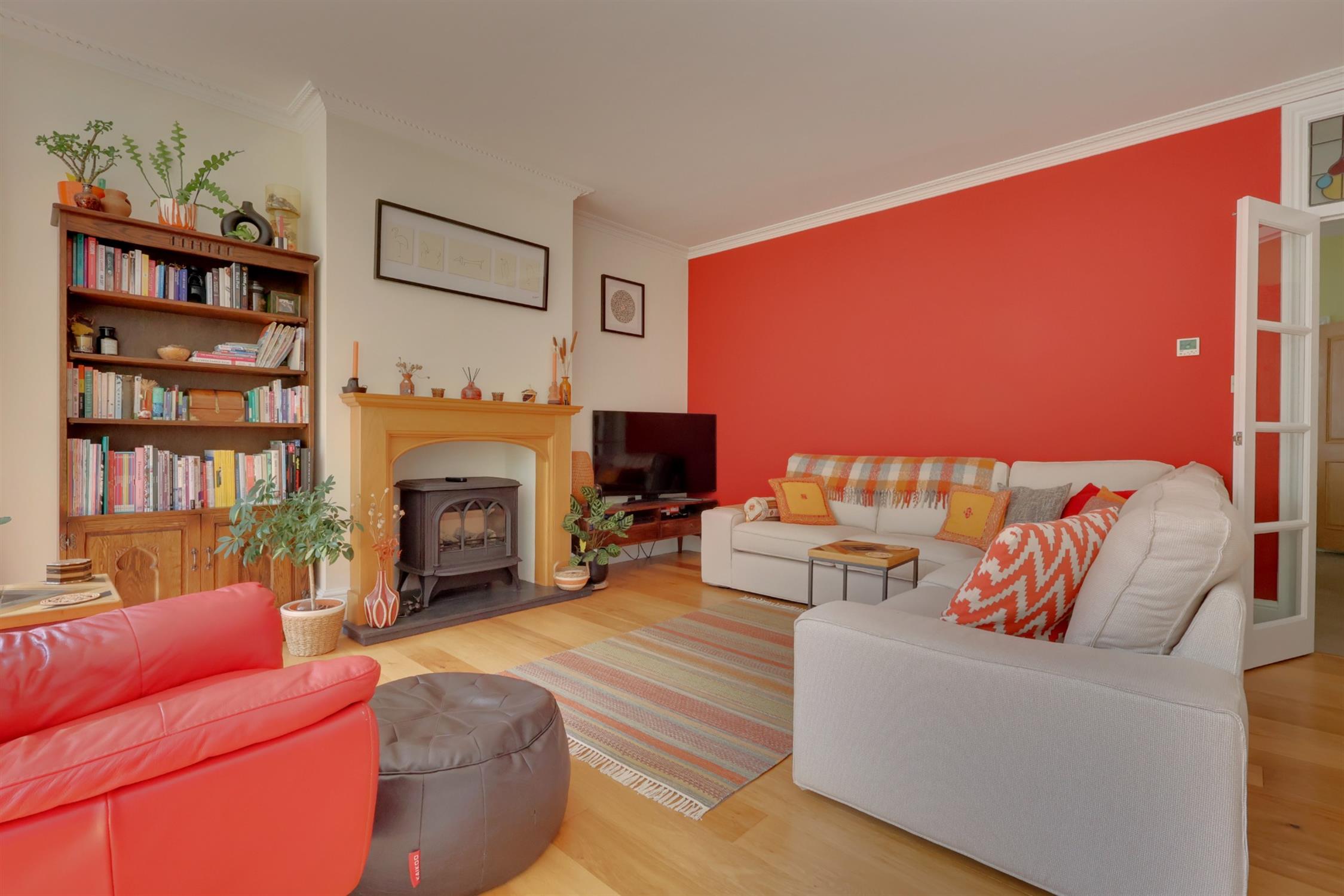 Gas fireplace. Underfloor heating. Wooden flooring. A range of double glazed windows with French doors opening into the garden.
