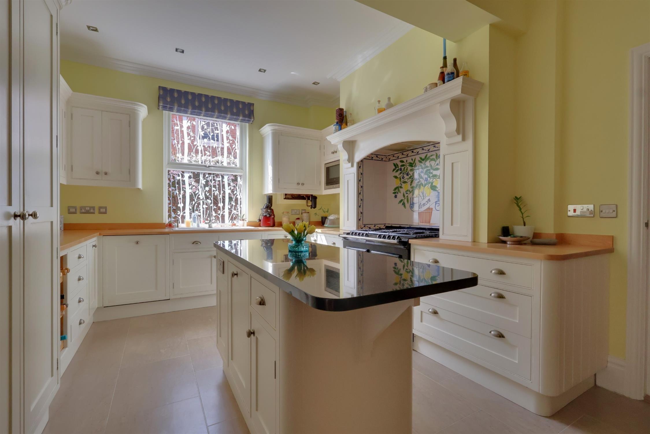 A range of wall and base cupboards with wooden work surface over. Range style oven with extractor fan over. Integrated dishwasher. Inset one and a half ceramic sink with drainer. Kitchen island with stone work surface. Double glazed window. Underfloor heating.