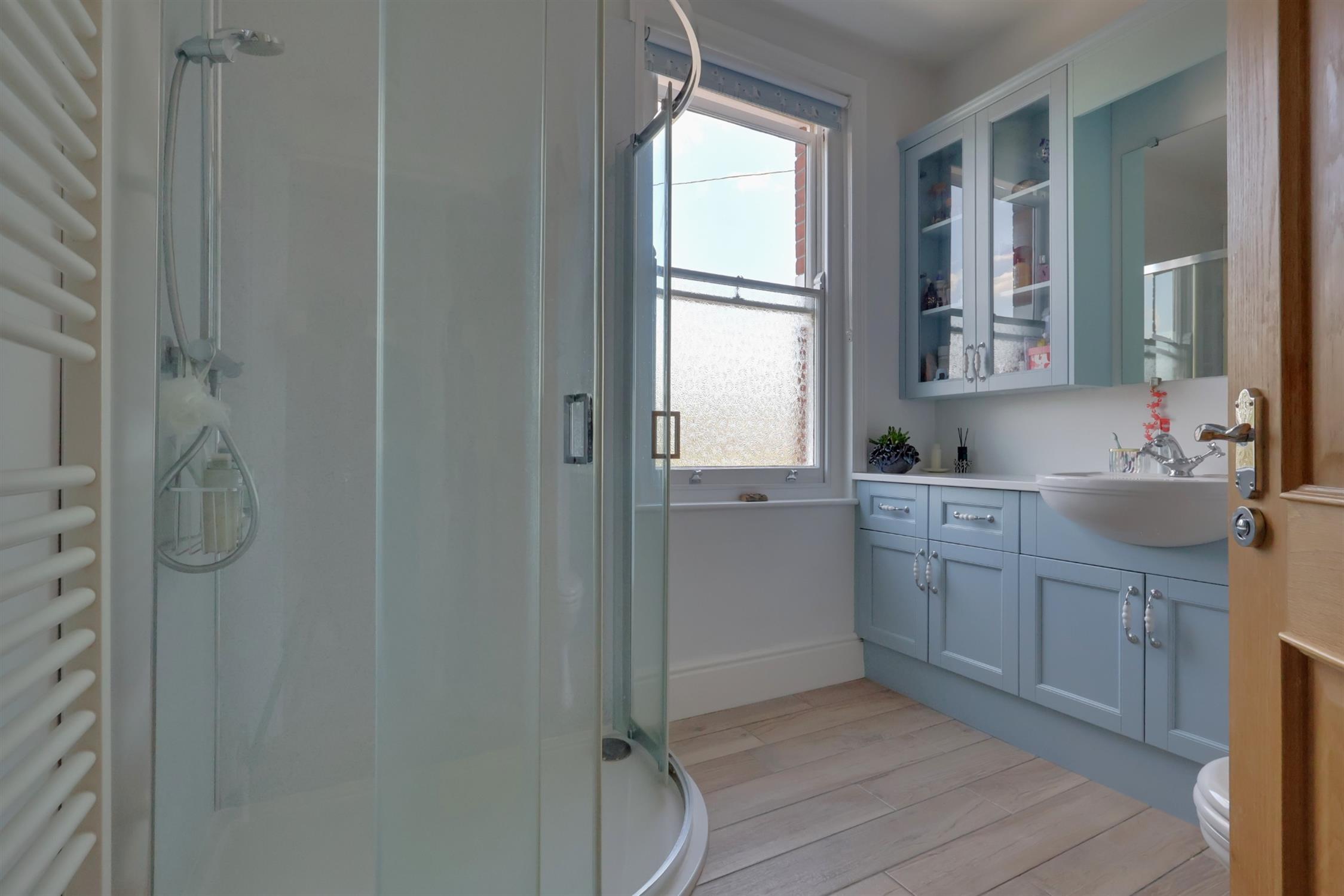 Shower cubicle. WC. Ceramic sink with cupboard under. Heated towel rail. Tiled flooring. Sash window.