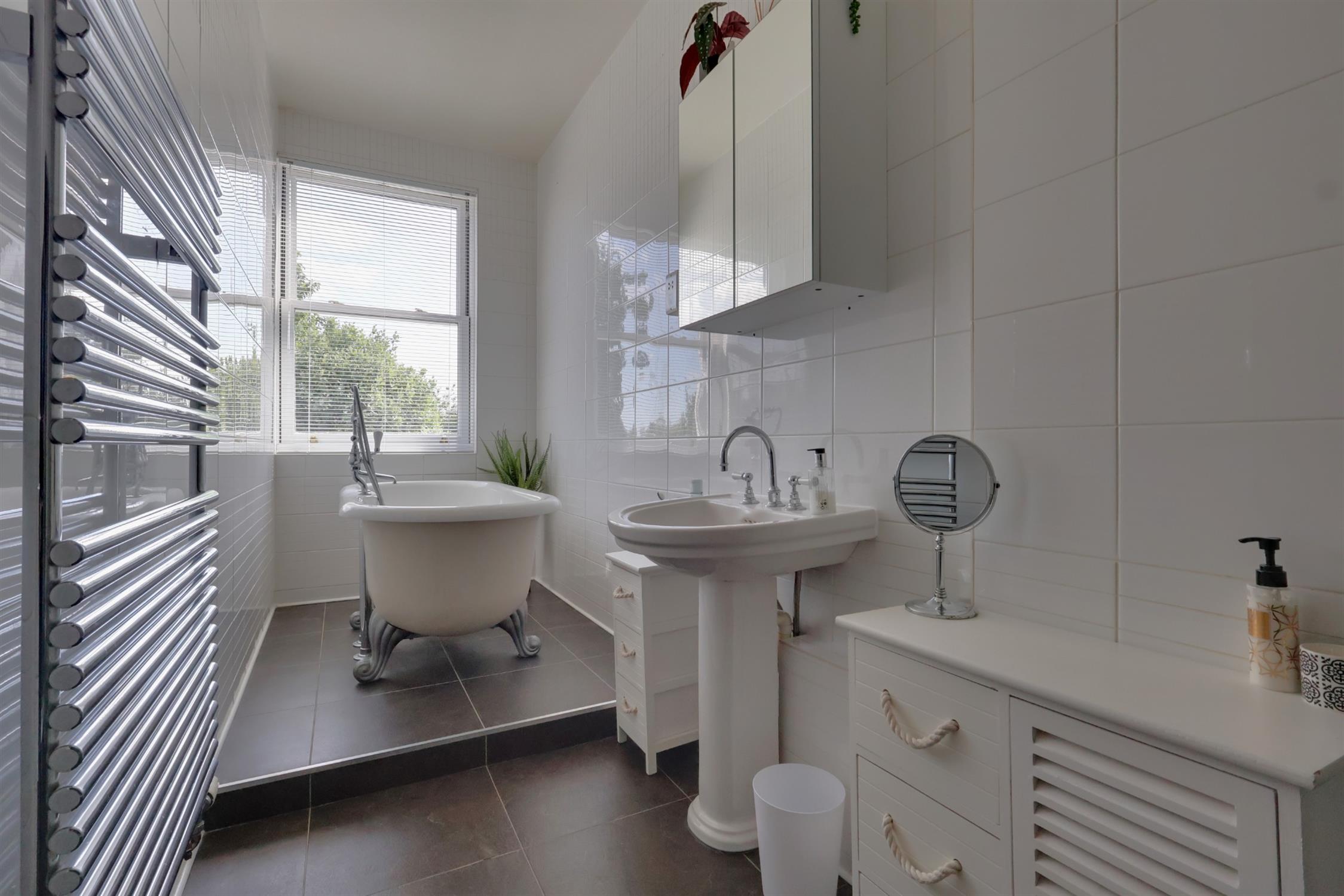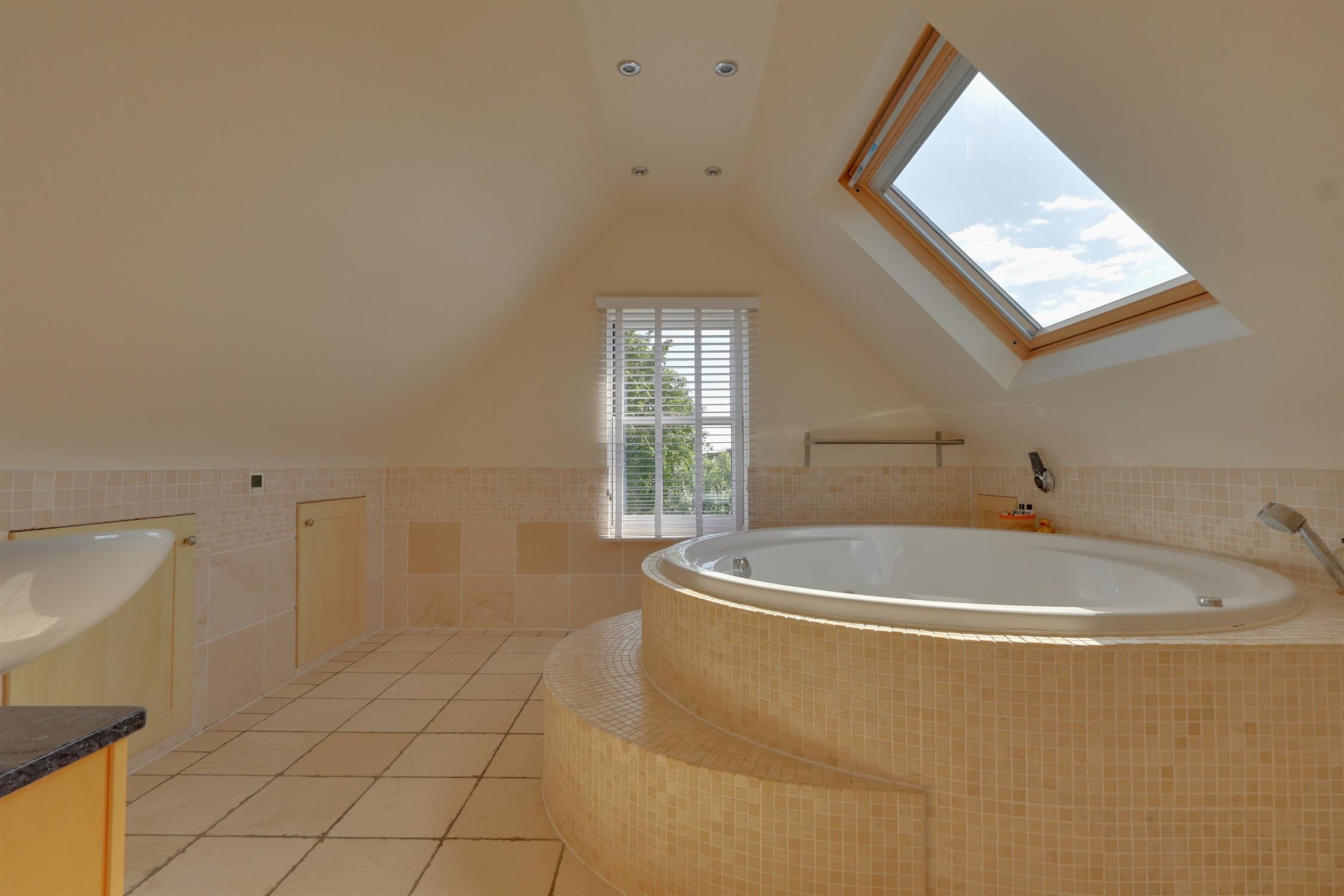 Underfloor heating. Jacuzzi bath. WC. Ceramic sink with cupboard under. Tiled flooring. Eaves storage. Double glazed sash window.