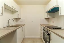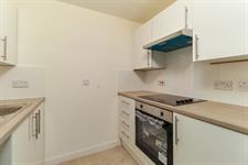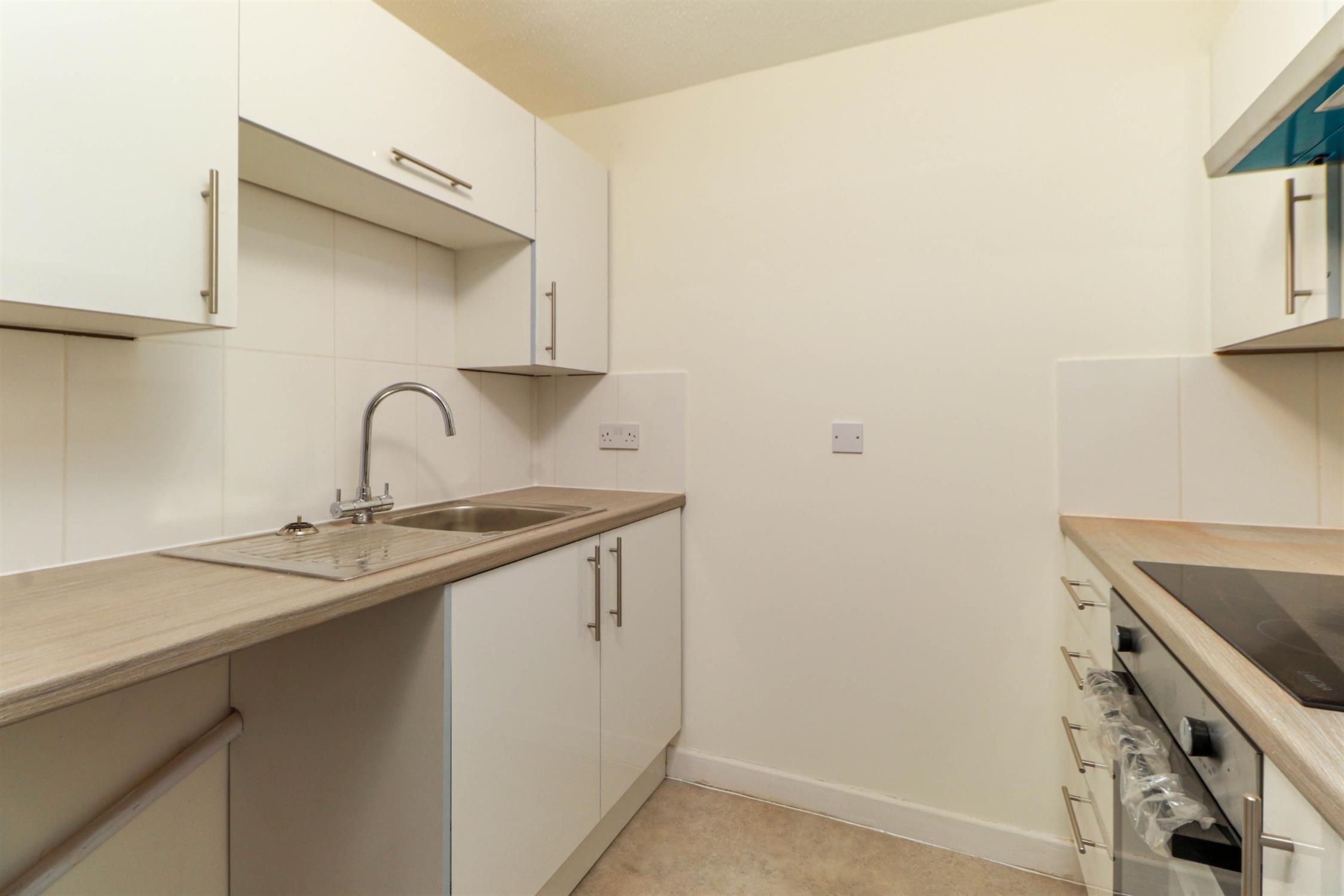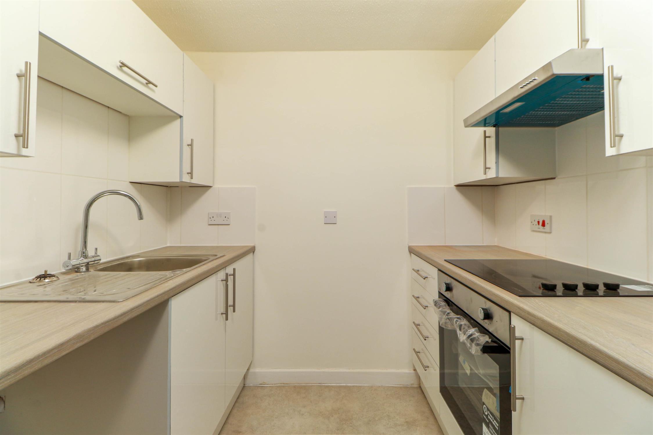 Textured ceiling, a new range of wall and base mounted units with work surfaces over, inset sink and drainer, integrated electric oven and hob with extractor over, space for under counter fridge, part tiled walls, vinyl flooring.