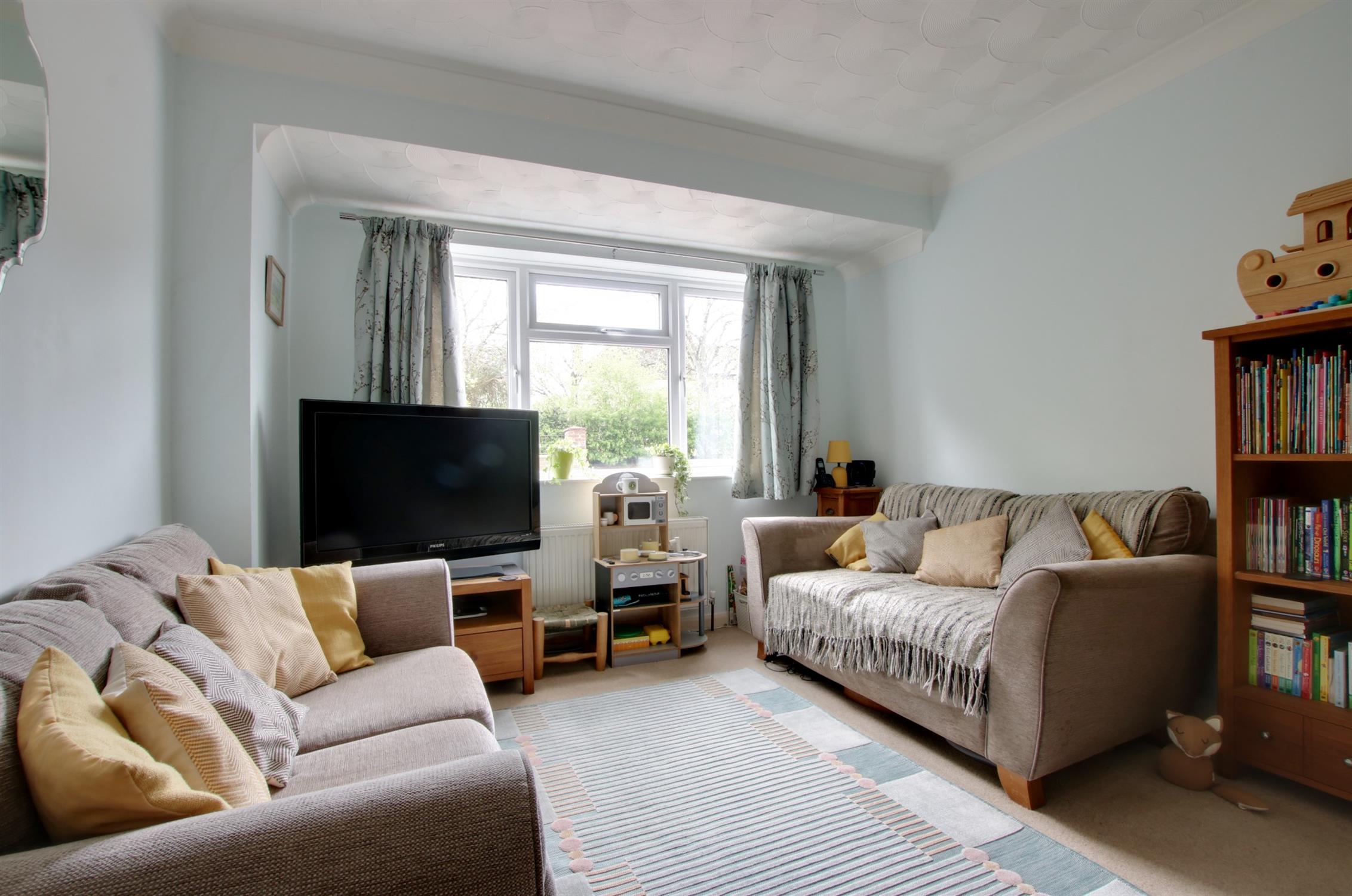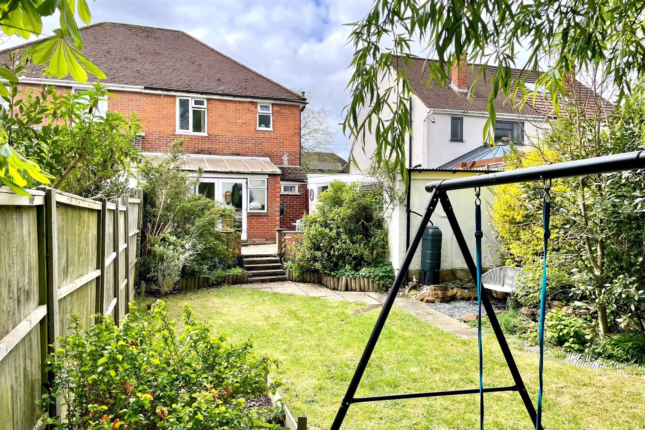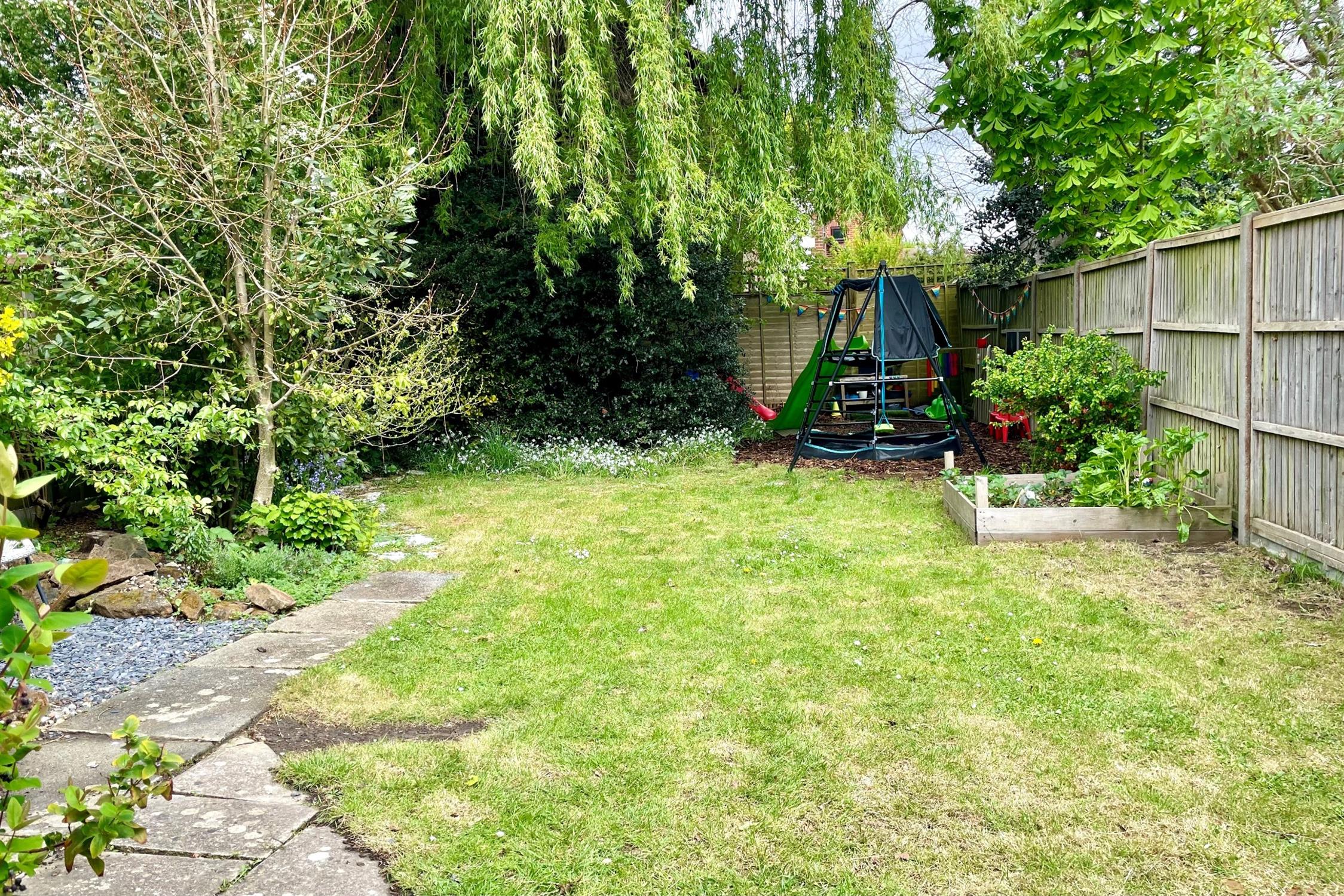 Immediately behind the property, there is a raised patio area with steps leading down to a good sized garden which is predominantly laid to lawn with established shrubs and plants. At the bottom of the garden, there is a Willow tree and an adjacent children's play area.