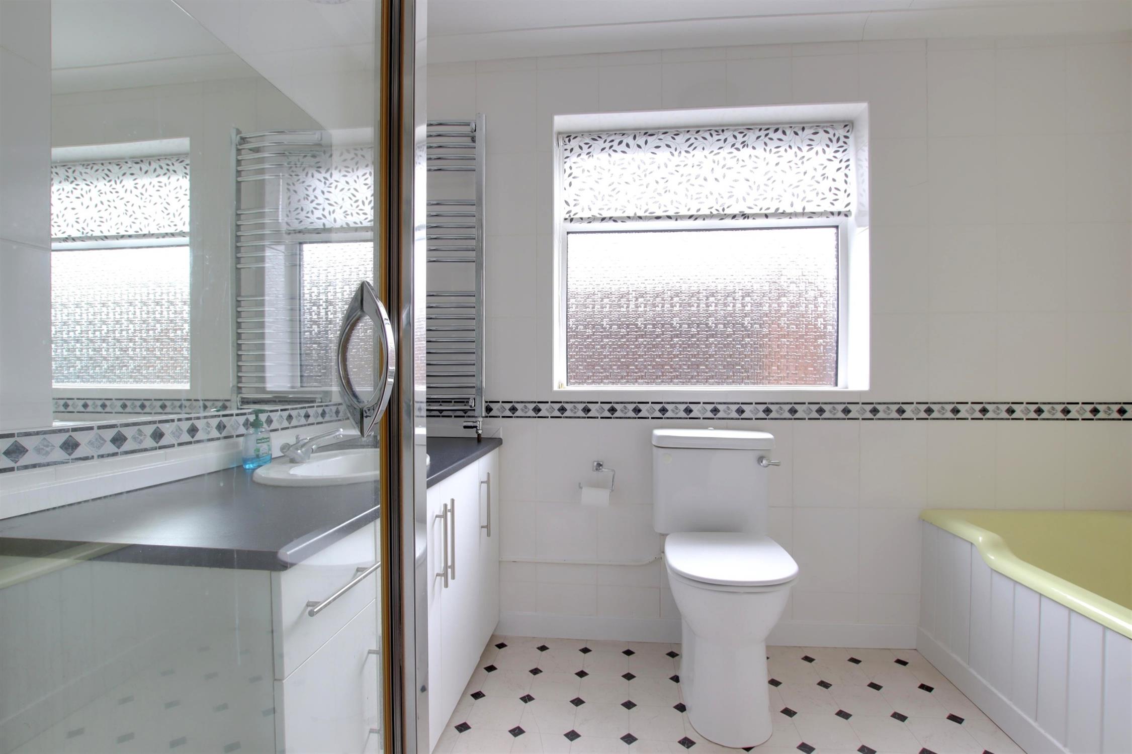 Double glazed obscure window to the side aspect. Smooth and coved ceiling. Four piece suite comprising bath with hand shower, shower cubicle, wash hand basin with storage beneath and low level WC. Heated towel rail. Tiled walls. Tile effect vinyl flooring.