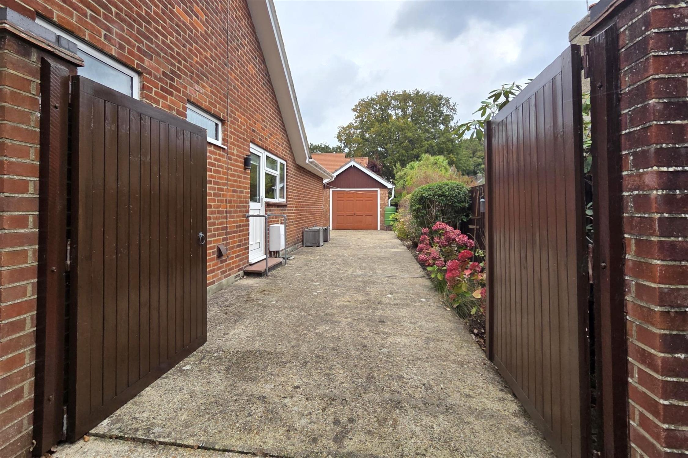 To the front of the property there is ample driveway parking and gated access leading to the side of the property and to the detached garage. Laid to lawn front garden with well-maintained borders. Beyond the double gates there is additional parking suitable for a boat/caravan/motorhome etc. Outside tap.