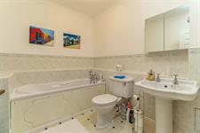 Smooth and coved ceiling, panelled bath with shower attachment, low level WC, pedestal wash hand basin, radiator, part tiled walls and vinyl flooring.