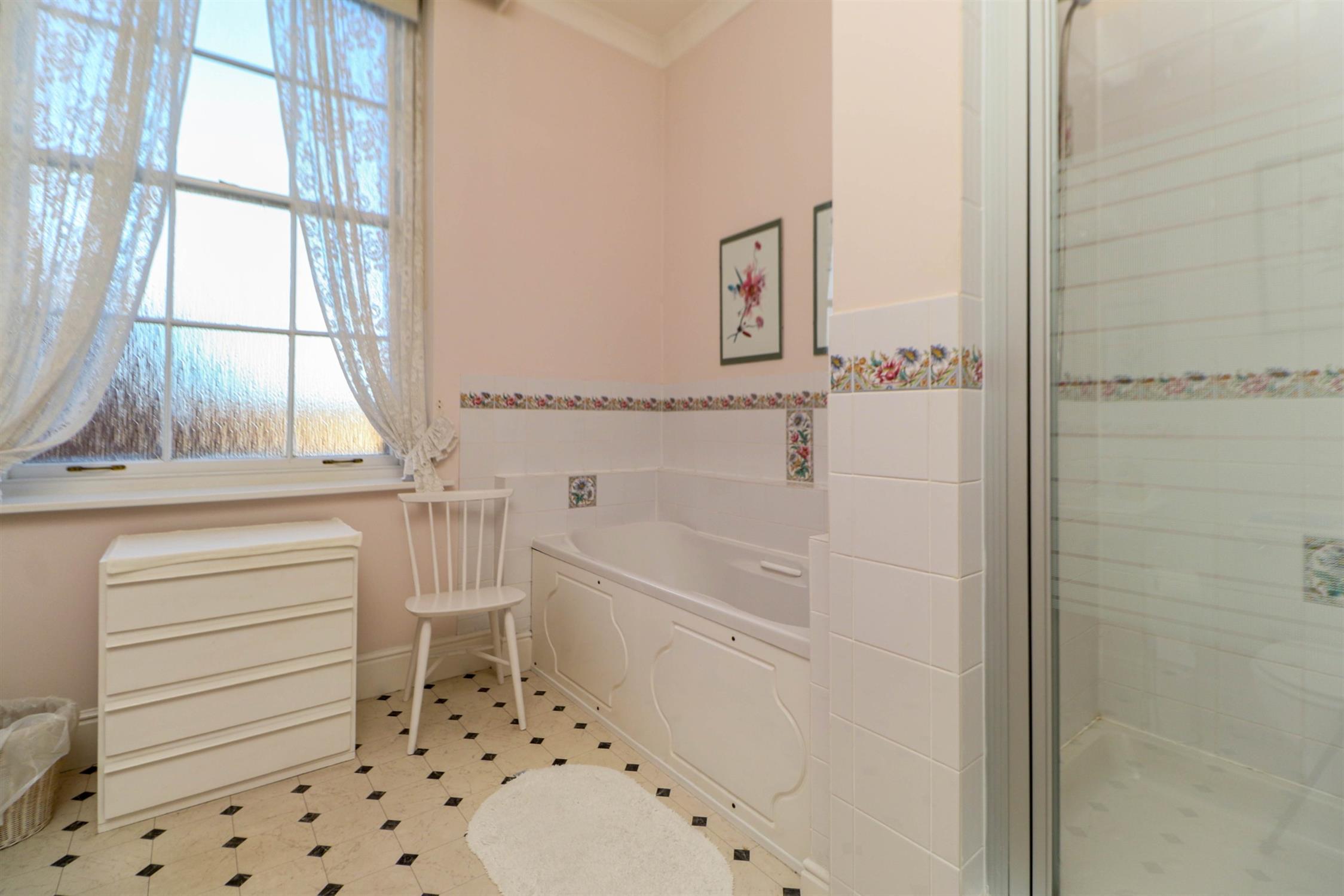 Smooth and coved ceiling, obscured sash window, panelled bath, separate shower cubicle, low level WC, pedestal wash hand basin, radiator and vinyl flooring.