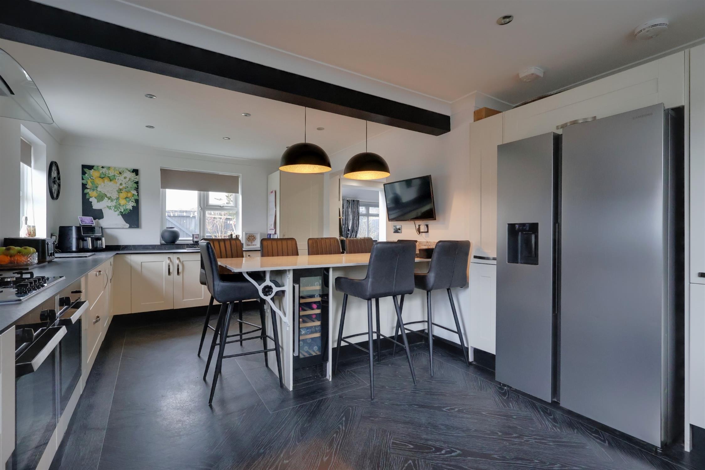 Double glazed windows to the rear, side and front elevations, wall mounted concealed boiler, a range of wall and base units with a hard top work surface over incorporating one and a half sink with a mixer tap over, integral five ring gas hob, double oven under and an extractor hood over, integral dishwasher, space for a fridge/freezer, integral washing machine, integral dryer, part tiled walls, smooth coved ceiling with inset spot lighting, breakfast bar with seating for six, built in wine cooler.