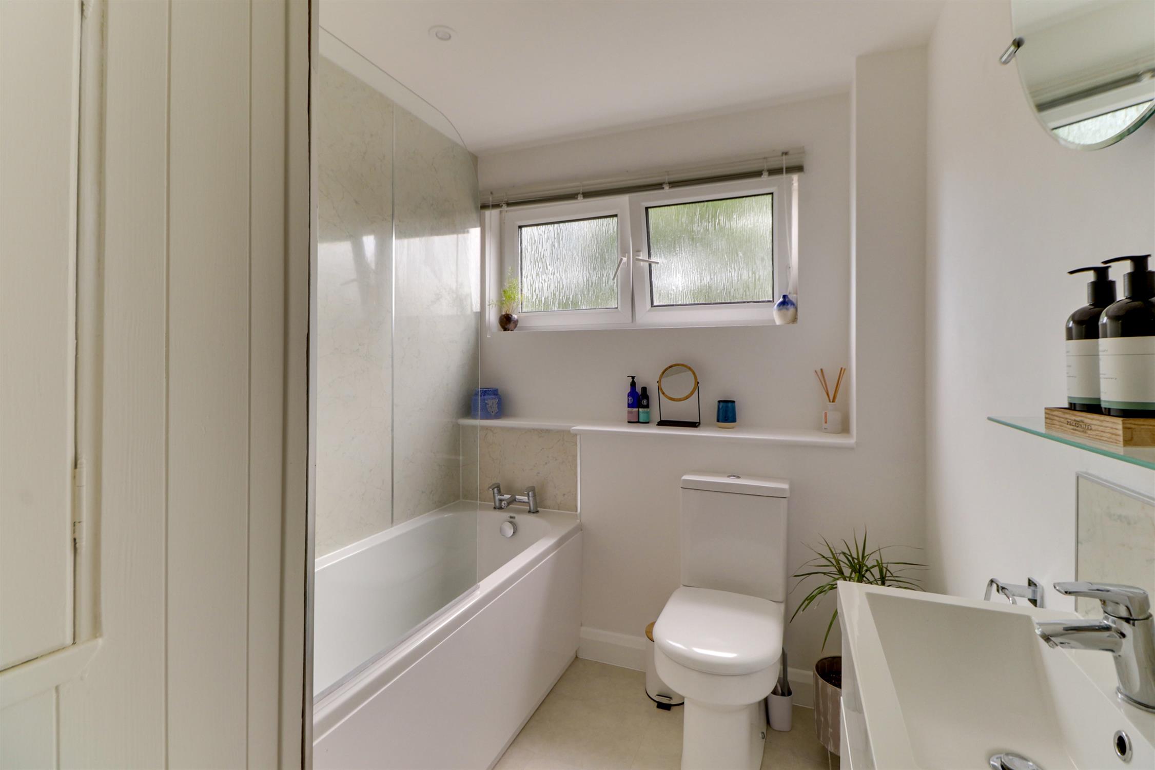 Smooth ceiling, inset spotlights, panel bath with shower over, obscured UPVC double-glazed window, low level W.C, wash hand basin, storage cupboard and vinyl flooring.