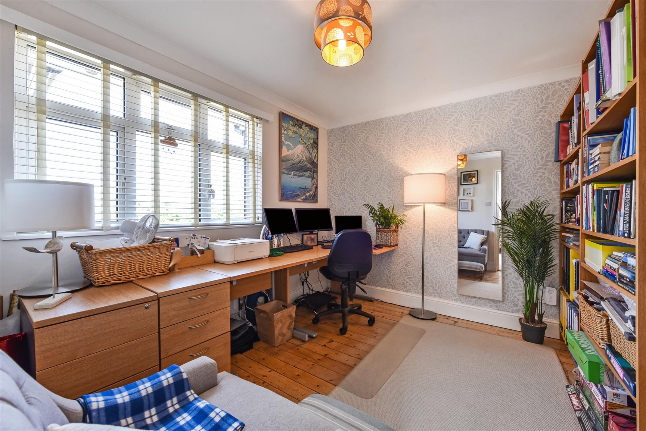 The landing provides access to the four bedrooms and family bathroom, along with access via a pull-down wooden loft ladder to the boarded loft space which has Velux windows to both front and rear elevations allowing maximum natural light into a space ideal for use as a study area, for hobbies, or children’s playroom. The main bedroom is to the front and features a curved bay window, wood-effect flooring and a range of wardrobes. There are two additional double bedrooms to the rear of the property and a good size single fourth bedroom with a front-facing aspect. The bedrooms are served by a stylish bathroom, the attractive suite comprising a panel enclosed bath with shower enclosure, wash basin and WC with integrated storage, and complementary wall tiling.
