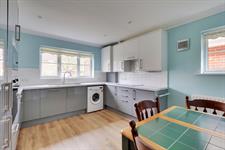 Range of recently fitted (2023) floor and wall units with contrasting work surfaces and complementary tiling. Inset electric hob with extractor hood over. Inset single drainer sink unit, built-in oven and microwave, integrated fridge freezer and dishwasher, washing machine. Wall mounted gas fired combination boiler. Oak style flooring, space for dining table and chairs and double glazed window to front.