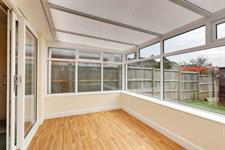 Brick and uPVC construction with polycarbonate roof, glazed door opening onto paved patio.