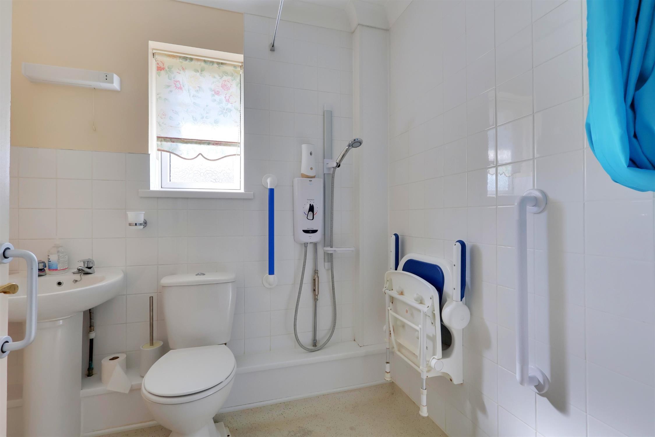 Part tiled walls. Low level WC. Pedestal wash basin with shaving light over. Wall mounted electric shower with pull down seat. Airing cupboard with radiator. Obscured double glazed window to side.
