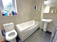 Obscure glazed window to side. Comprising white suite of panelled bath with shower over and glazed screen. Pedestal wash hand basin. Close coupled WC. Ceramic tiled flooring. Ceramic tiled walls. Mirror fronted cupboard with lighting over. Chrome heated towel radiator.