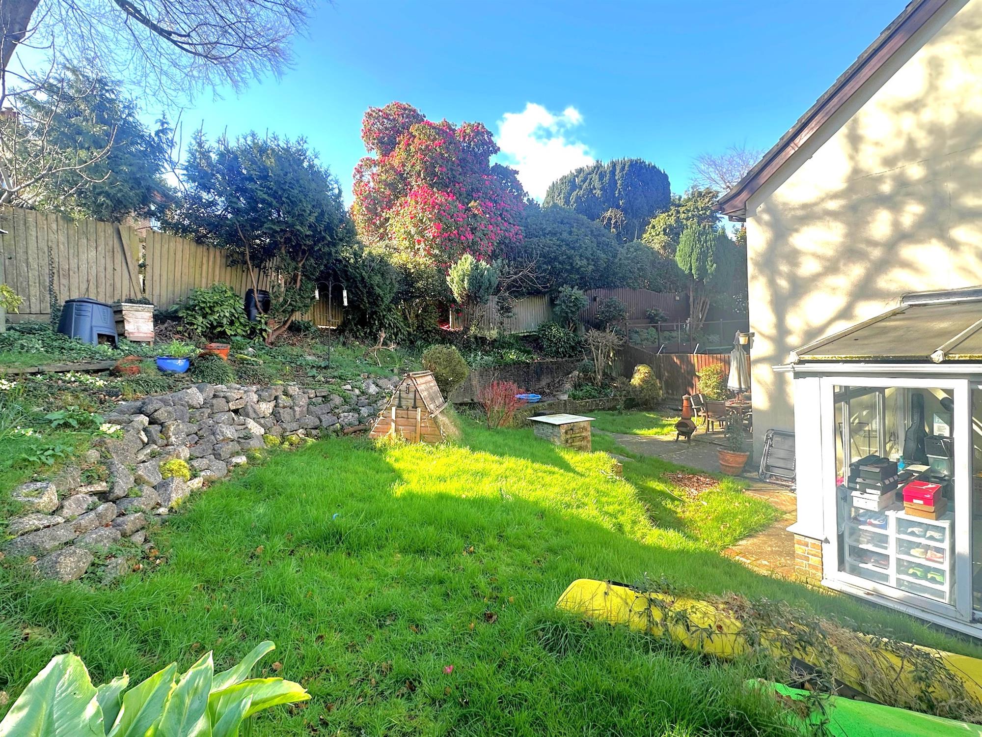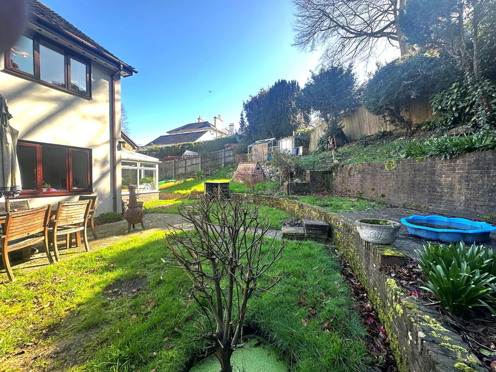Fenced to boundaries. Laid to lawn with retaining stone walling. Greenhouse. Garden shed. Patio area. Outside tap.