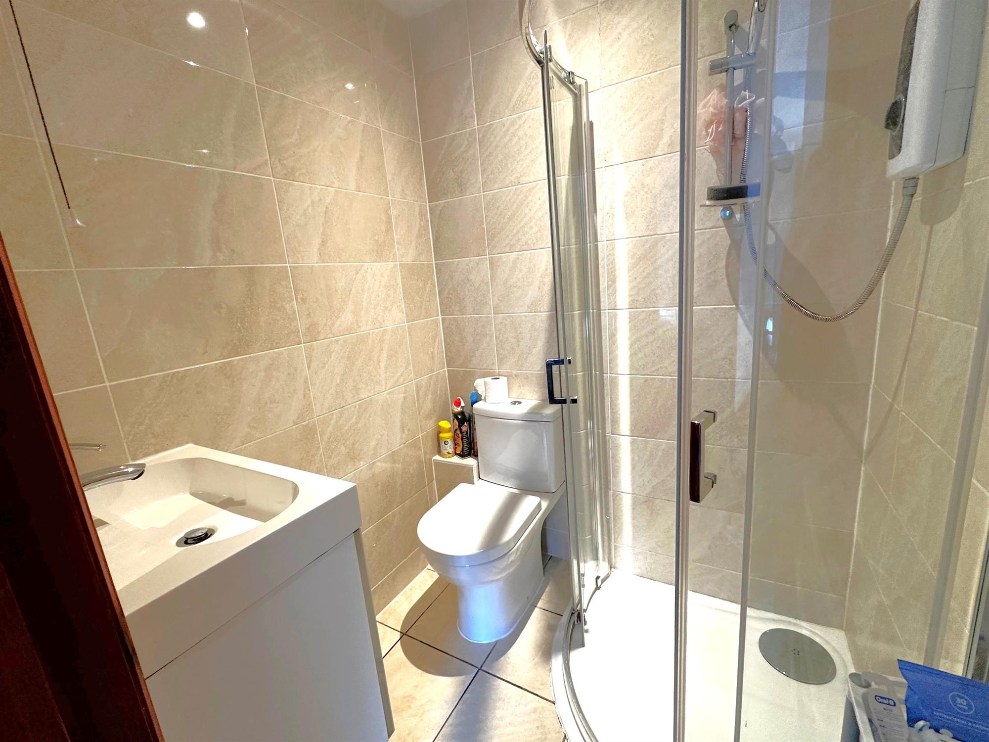 Comprising white suite of corner shower cubicle. Close coupled WC. Wash hand basin with built in cupboard below. Ceramic tiled flooring. Ceramic tiled walls. Extractor fan.