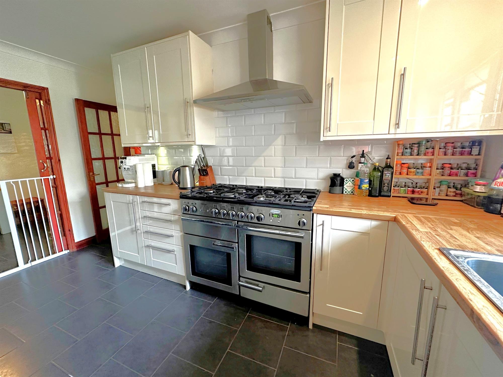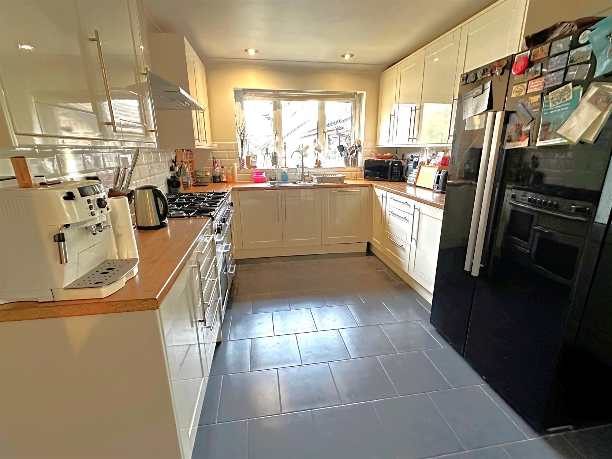 Window to front. Ceramic tiled flooring. Fitted with a range of base and wall units with working surfaces over. Complementary tiling to splashbacks. Rangemaster cooker with extractor hood over. One and a half bowl stainless steel sink unit with mixer taps. Integrated Bosch dishwasher. Space for American style fridge freezer. Concealed lighting. Radiator. Doors to: