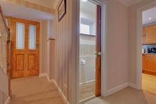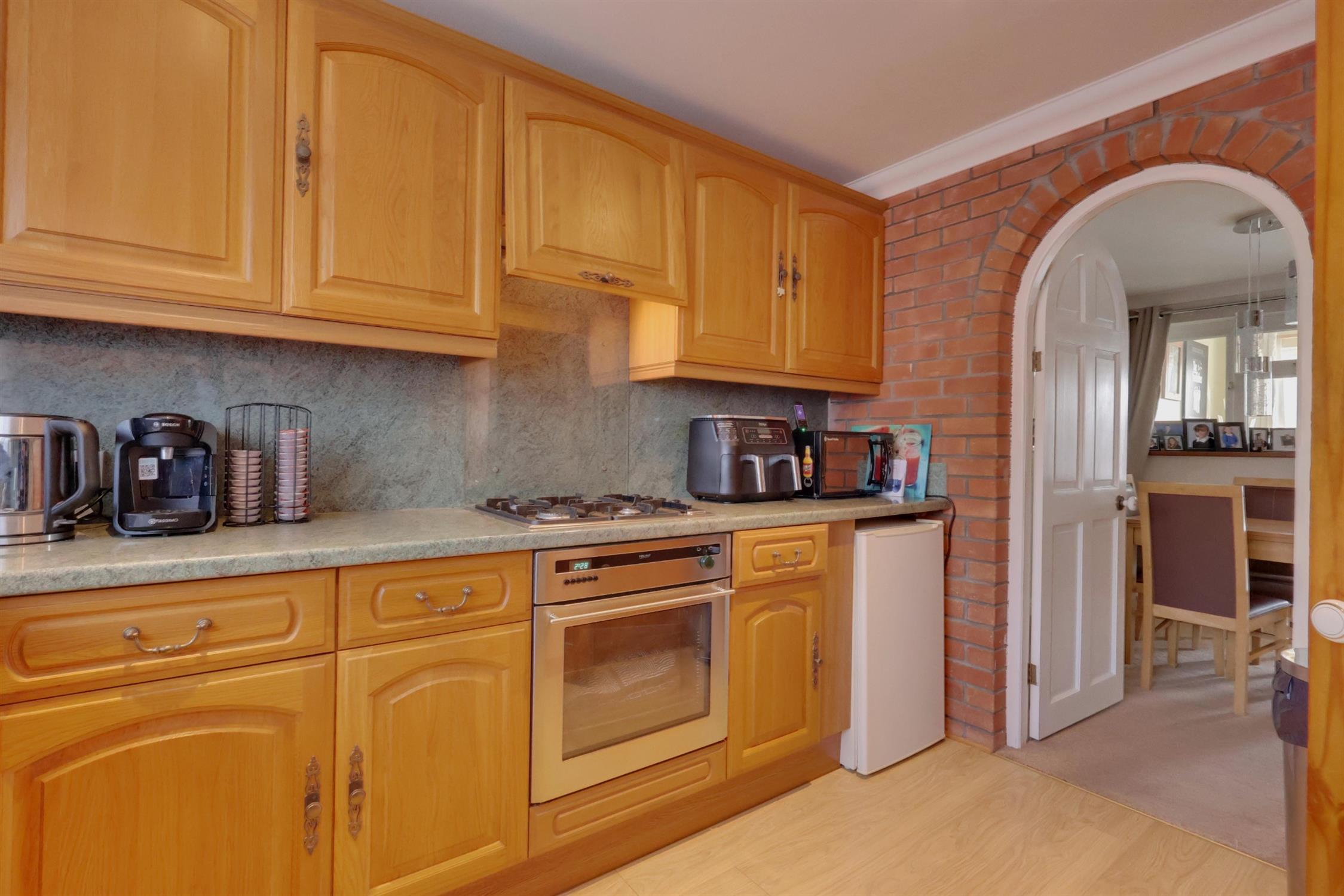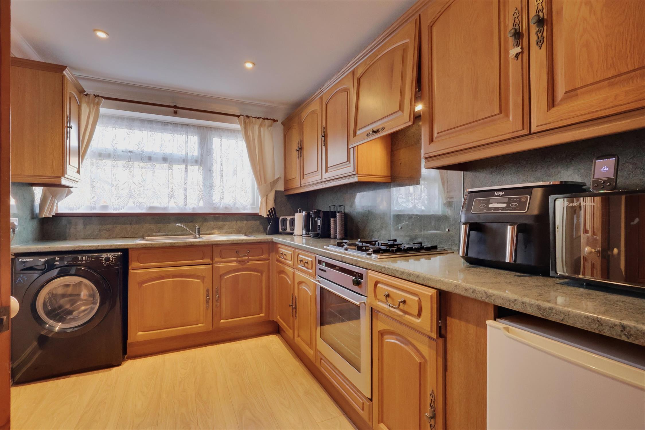 A range of wall and base cupboards with work surface over. Stainless steel sink with drainer. Four ring gas hob with extractor fan over. Integrated oven. Plumbing for washing machine. Pantry cupboard. Double glazed window.