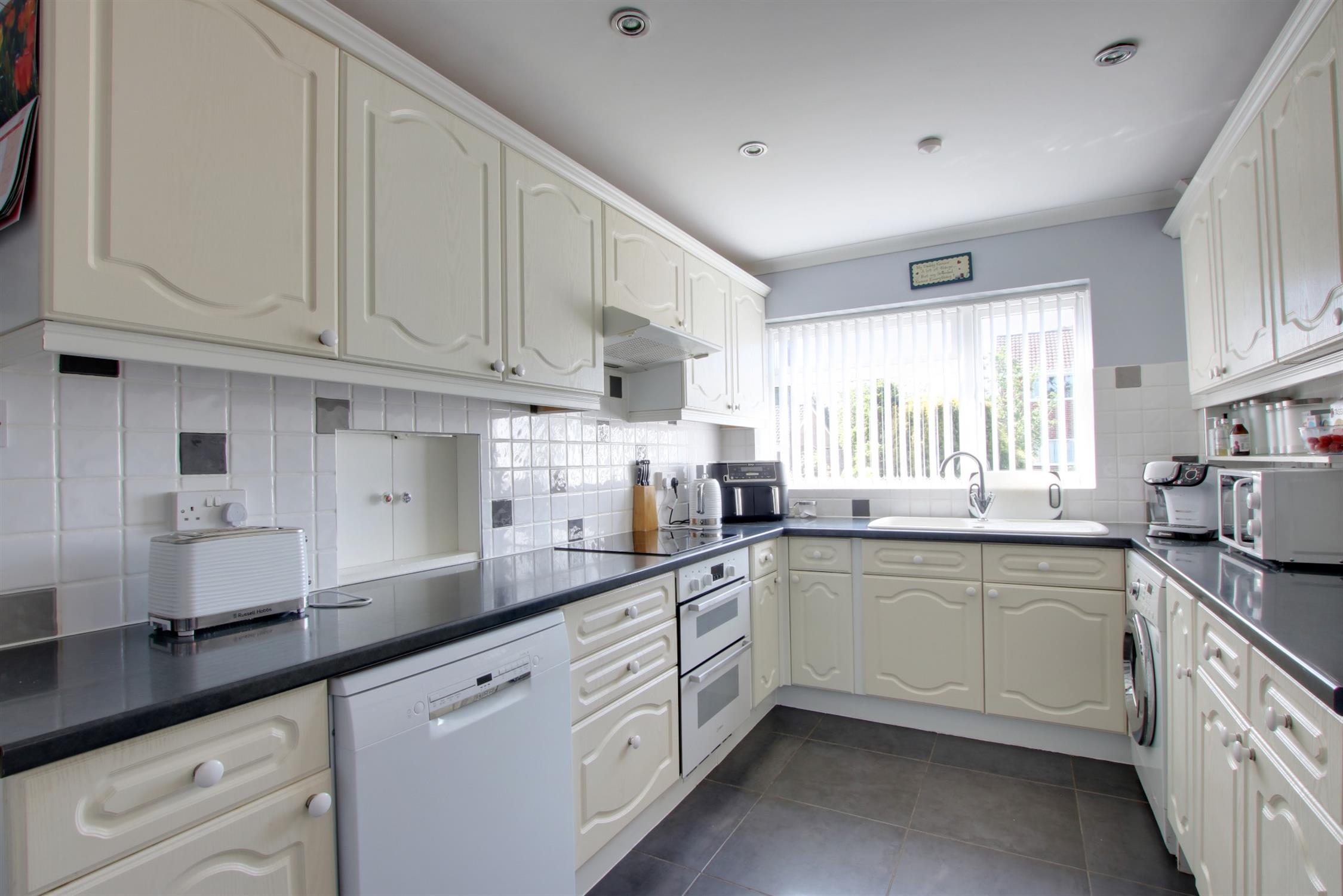 Double glazed window to front elevation and double glazed door to side. Kitchen comprising; single drainer sink unit with cupboard under. Further range of wall and base level units with roll edge work surfaces over and splashback tiling. Built-in four ring ceramic hob with cooker hood over and electric oven beneath. Plumbing for washing machine. Recess for fridge. Space for upright fridge/freezer. Understairs storage cupboard. Serving hatch to dining room. Tiled flooring. Heated towel rail. Coved and skimmed ceiling.