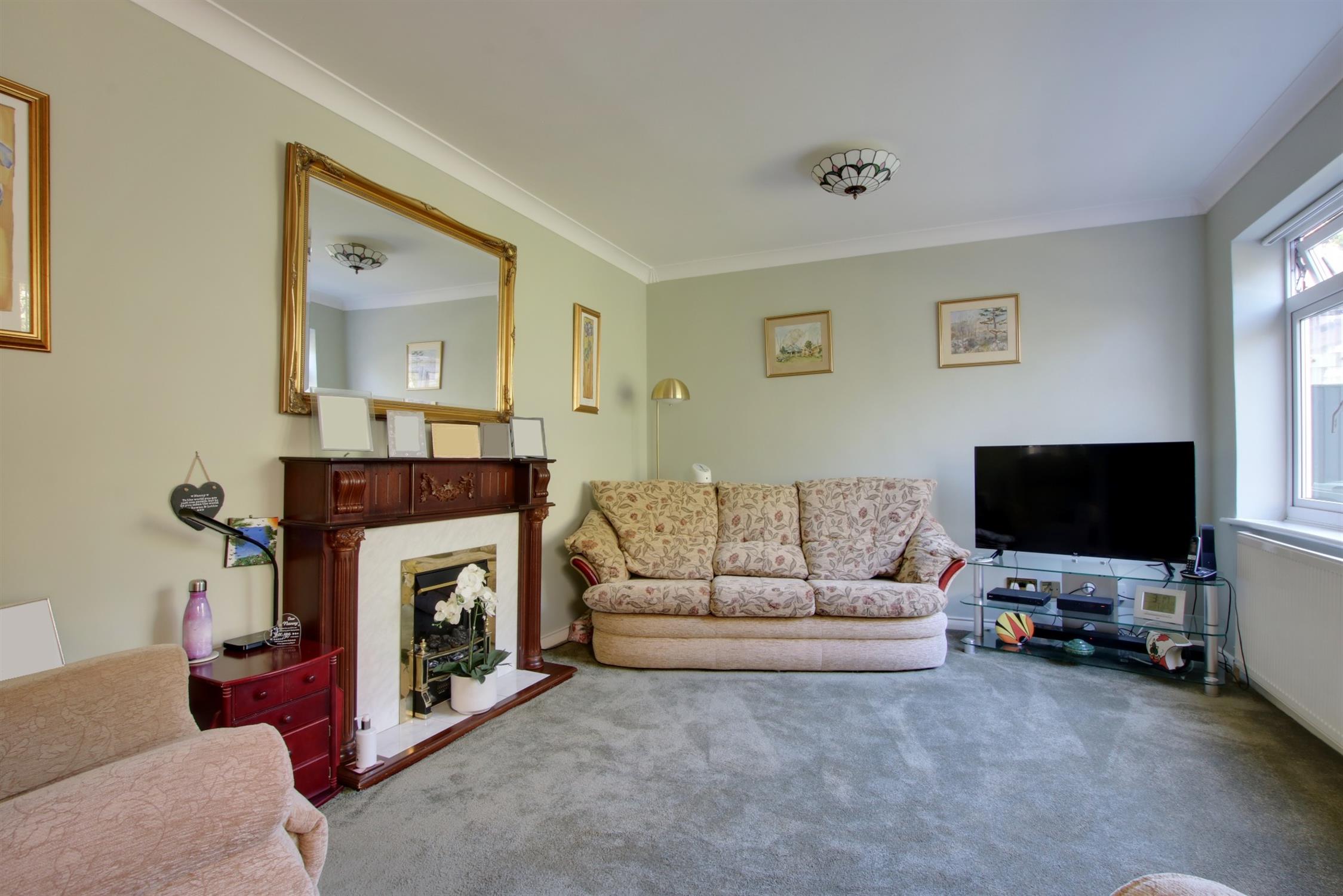 Double glazed window to rear elevation and double glazed French doors to conservatory. Feature fireplace with inset coal effect electric fire. Coved and skimmed ceiling. Radiator.