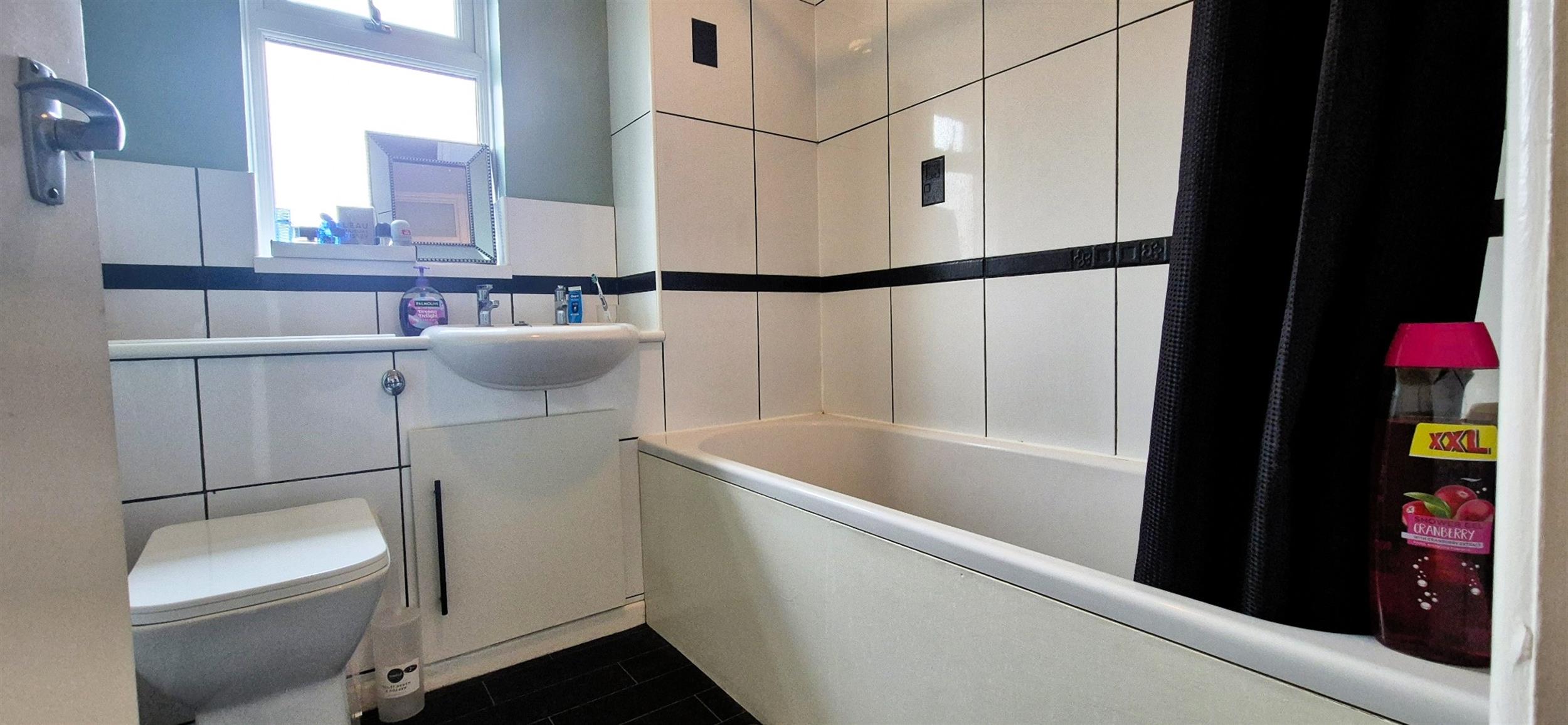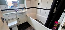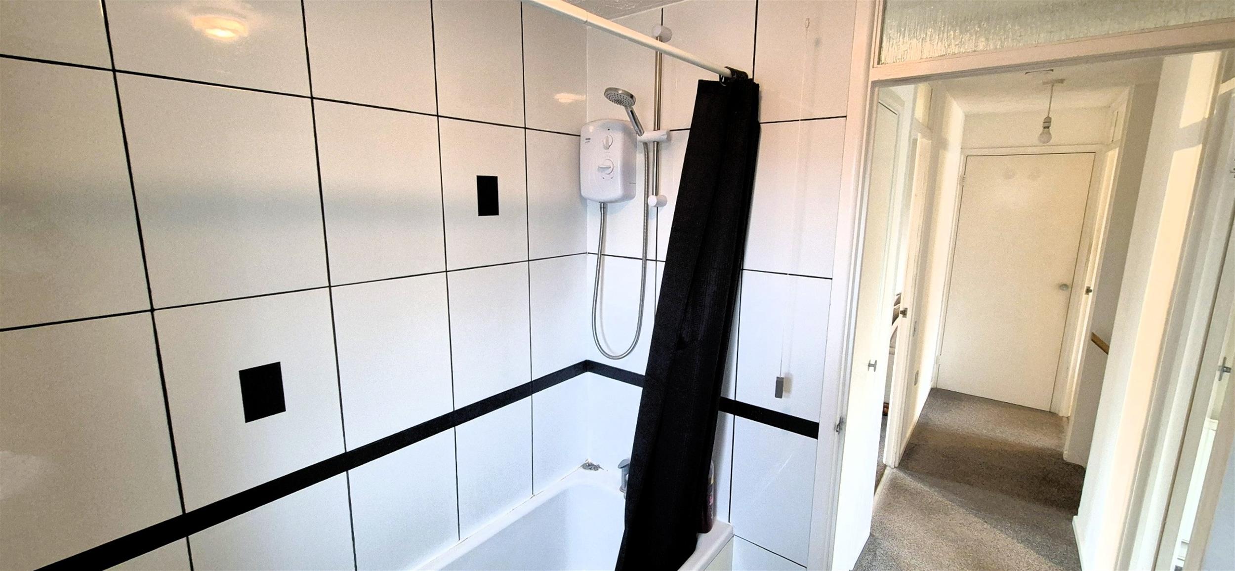 White suite with sink, toilet and bath with electric shower. Window to the side.