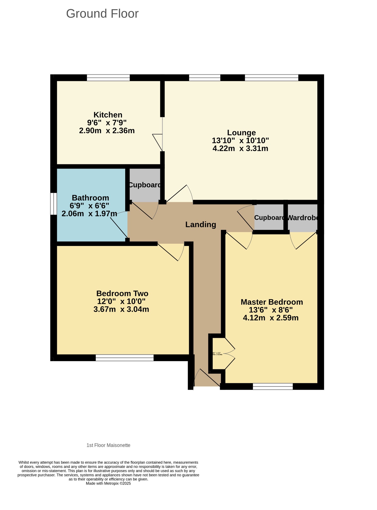 LANDINGDoors to bedroom 1, bedroom 2, lounge, bathroom, and 2 storage cupboards.